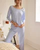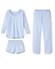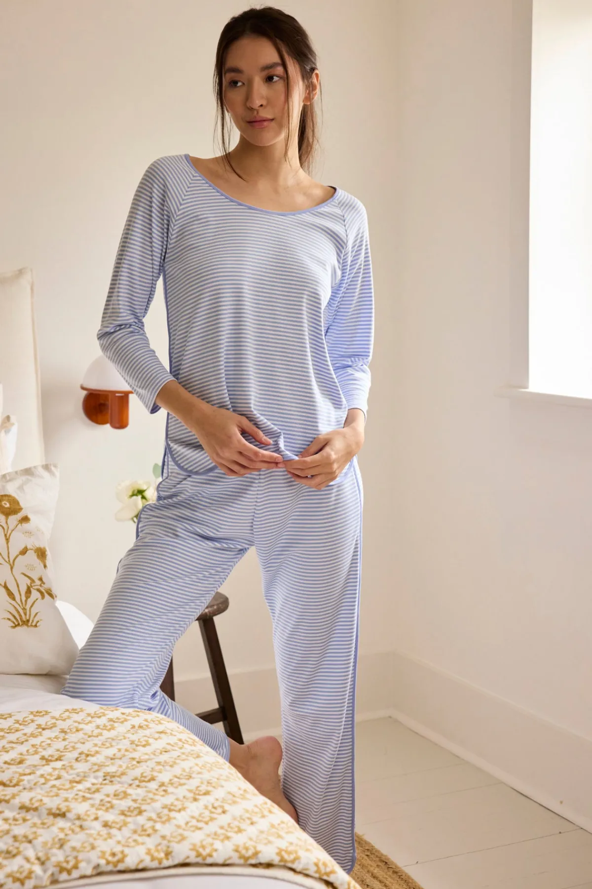 The Bundle in Hydrangea, our best-selling purpley blue, includes a three-quarter sleeve scoop neck top, shorts, and pants with an elastic waistband. Made from 100% Pima cotton.