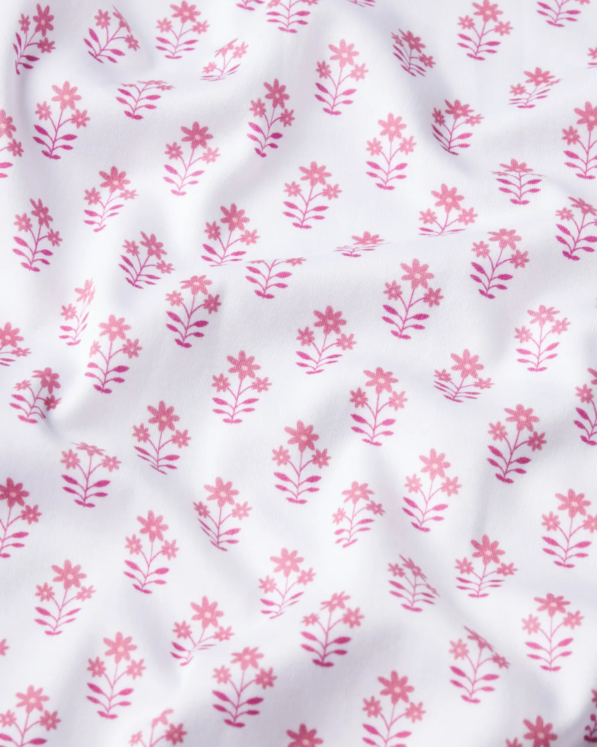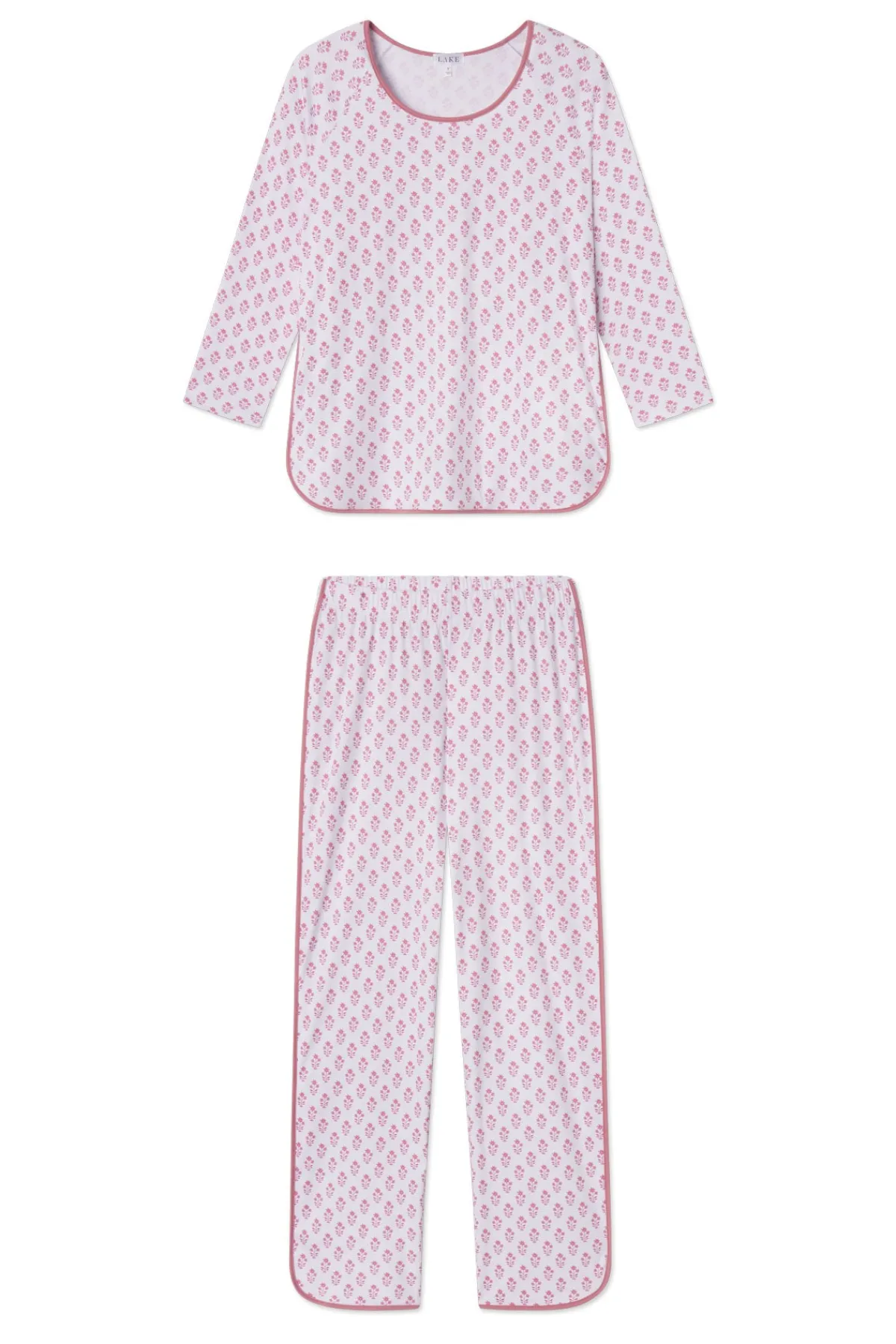 The Pima Long-Long Set in Light Camellia Posy, petite, soft pink bouquets, features a three-quarter sleeve scoop neck top and pants with an elastic waistband. Made from 100% Pima cotton.