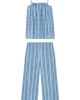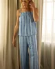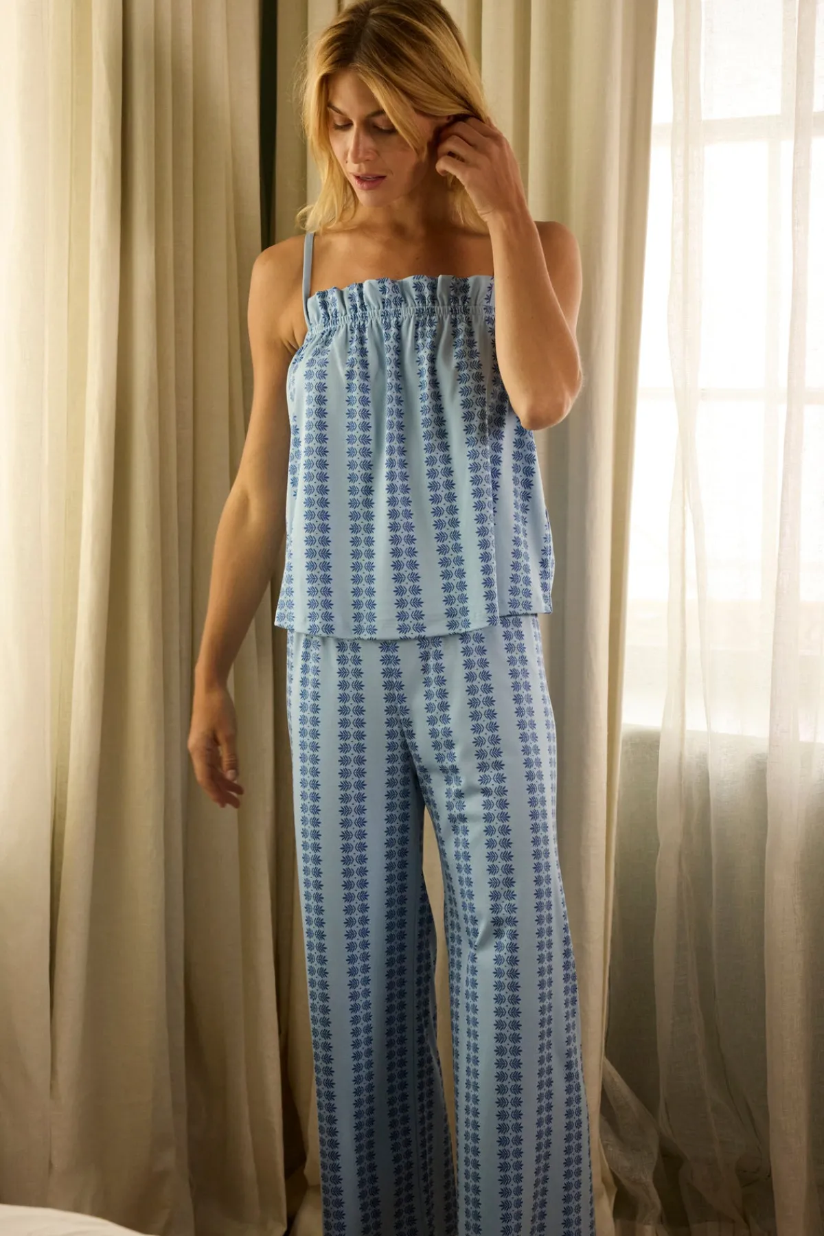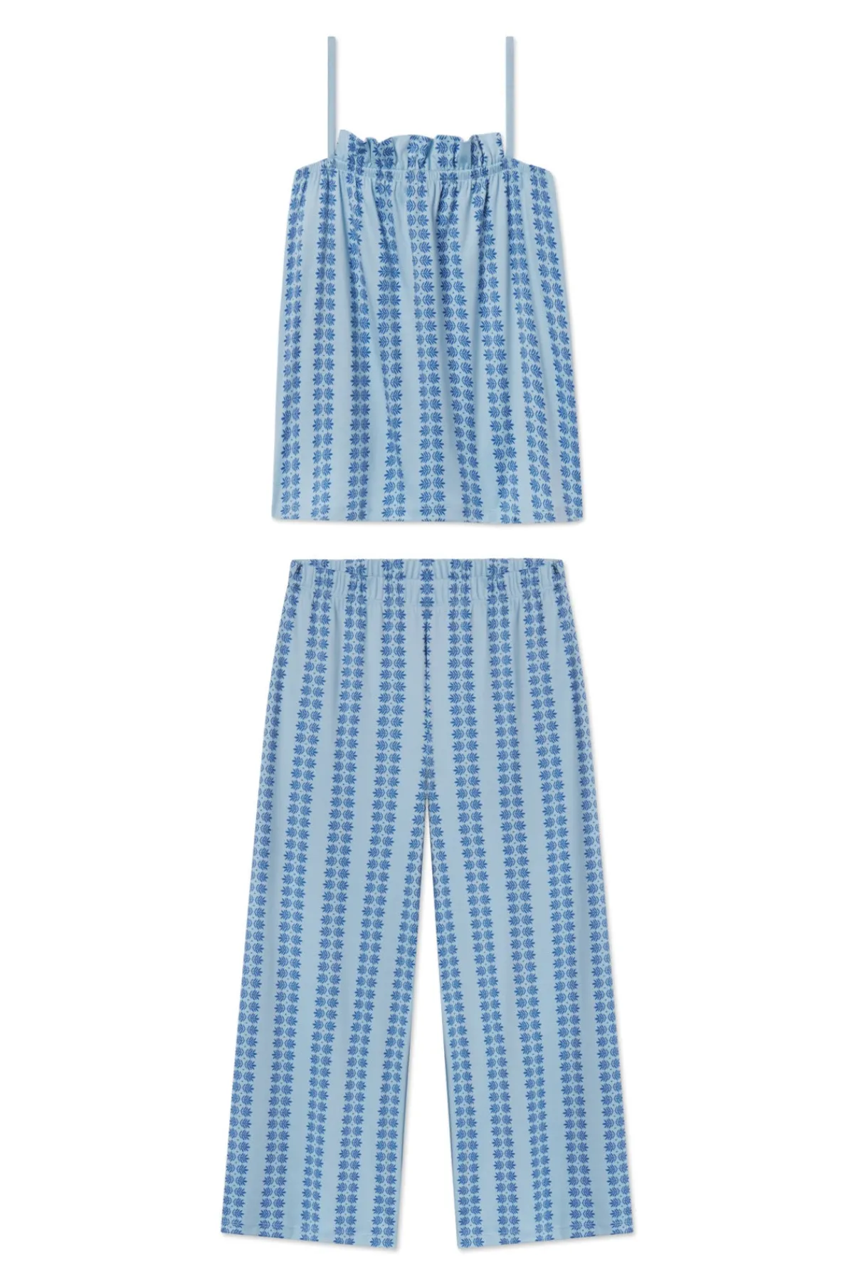 The Ruffle Pants Set in French Blue Trellis, a tonal botanical print set on powder blue, features a feminine ruffle detail across the front and adjustable spaghetti straps with a fully elasticated top. The cropped, wide-leg pants have an elastic waistband. Made from 100% Pima cotton.