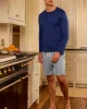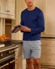 The Menโs Pima Sleep Shorts in Anchor Blue feature a functional drawstring, on-seam pockets, a faux fly, and an elastic waistband. This pajama short is designed to hit above the knee. Made from 100% Pima cotton.