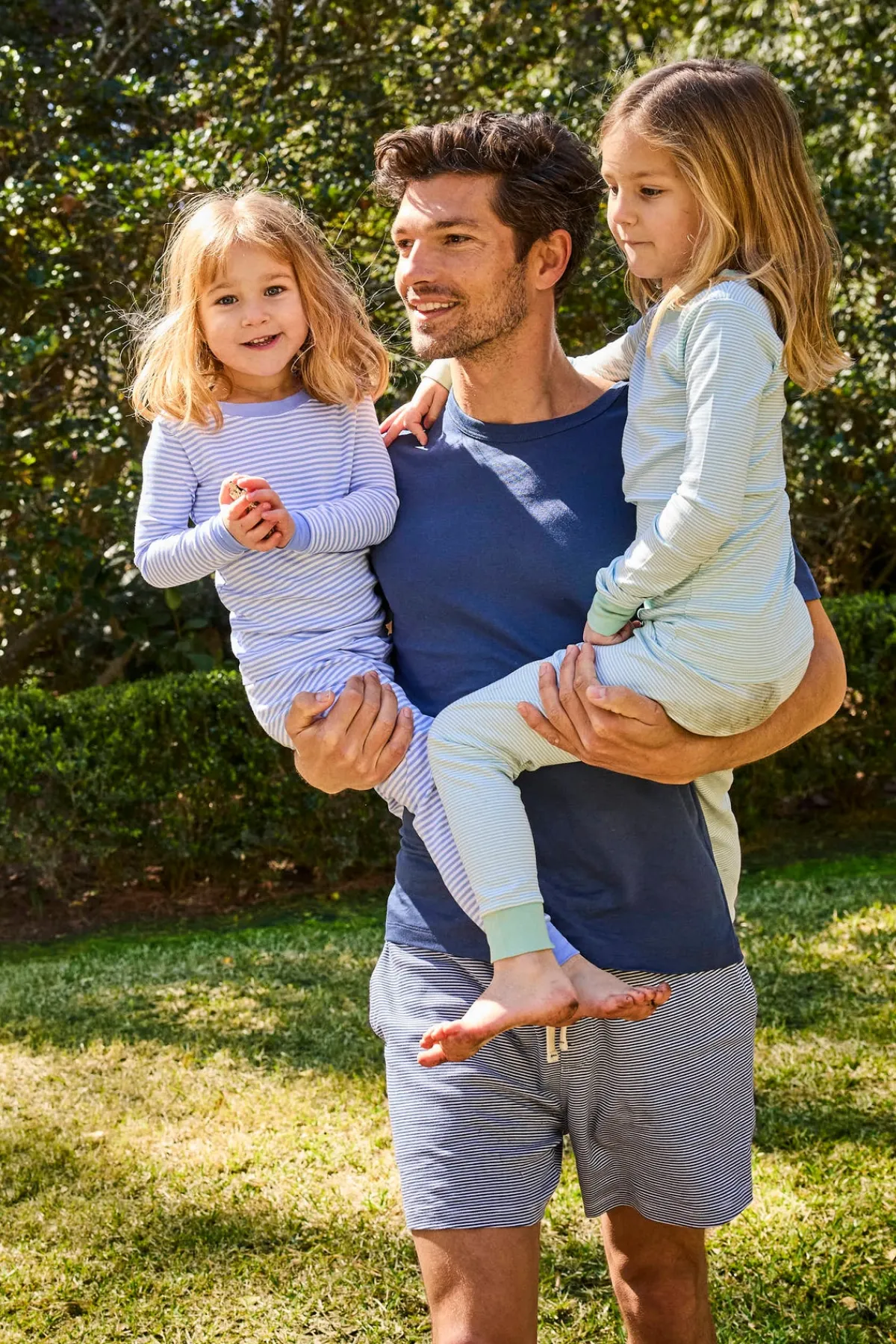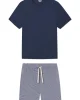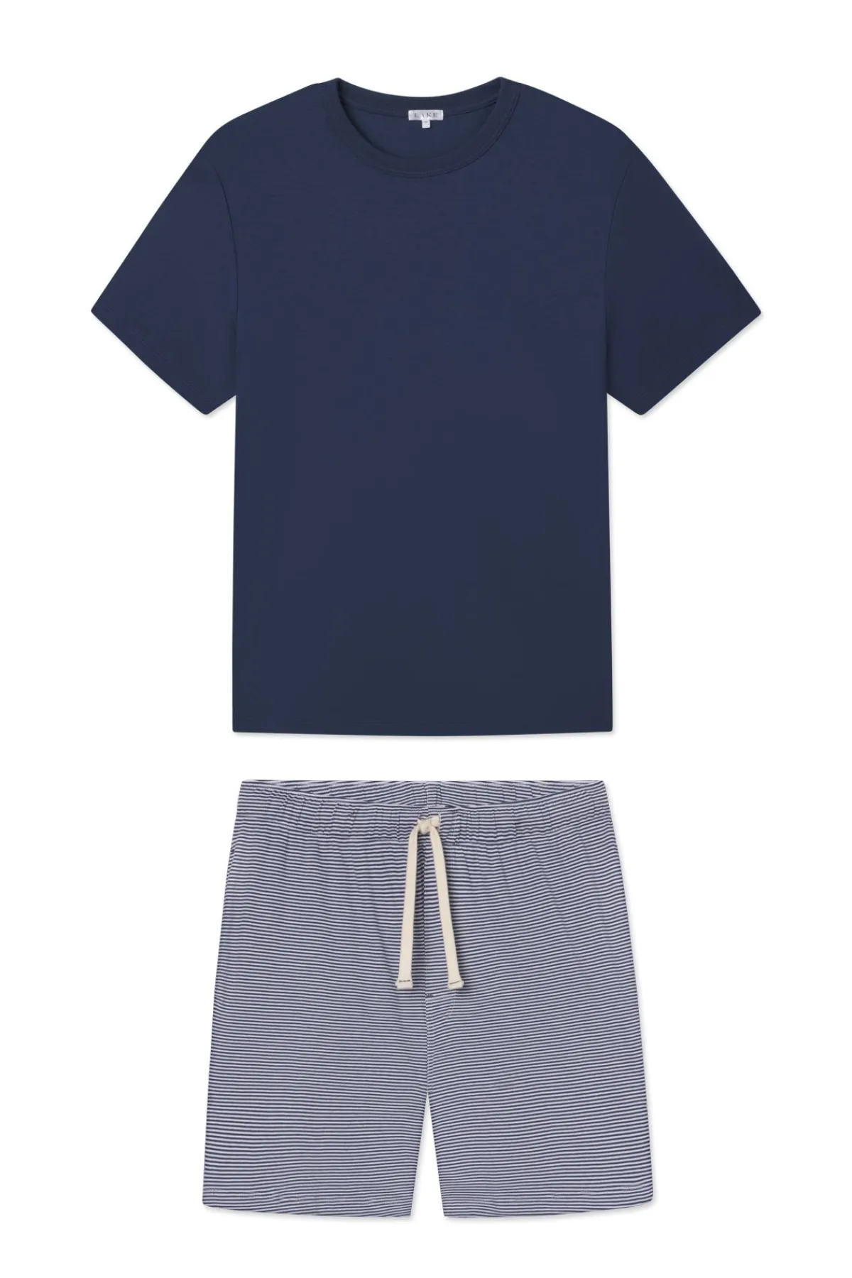 The Men’s Pima Pajama Shorts Set in True Navy features shorts with a navy and white micro stripe, an elastic waistband, a faux fly, drawstring tie, and pockets paired with a solid navy blue short-sleeve Pima tee. Made from 100% Pima cotton.
