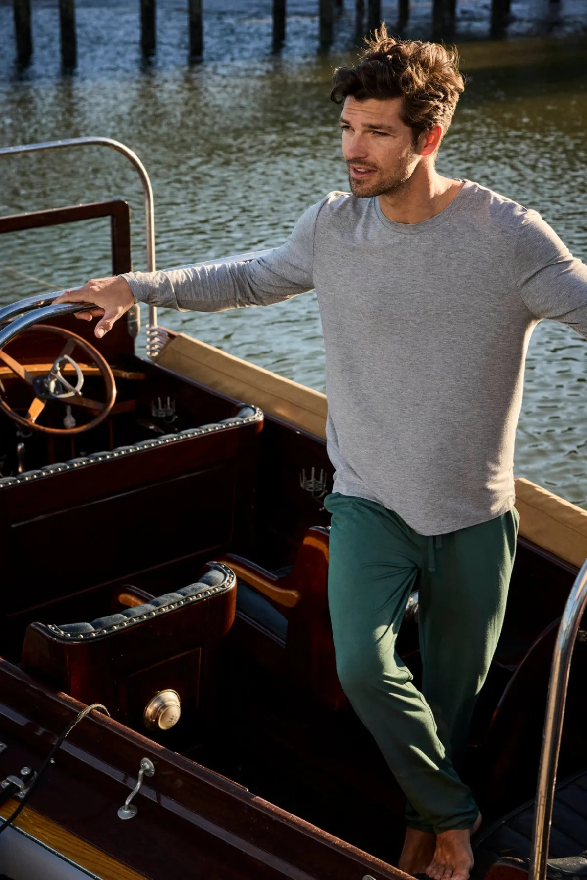 The Mens Long Sleeve Bamboo Tee in Heather Gray is ideal for a nightcap before bed and weekends on the boat. Made from 95% bamboo and 5% spandex.