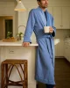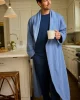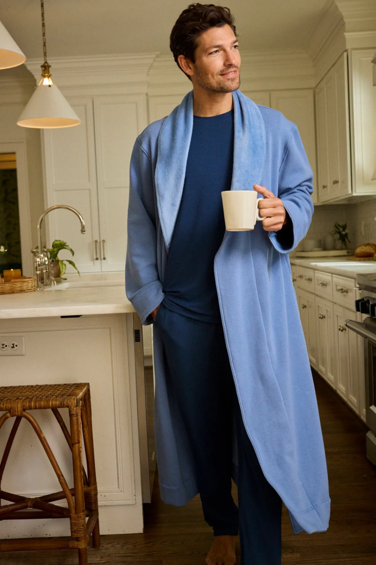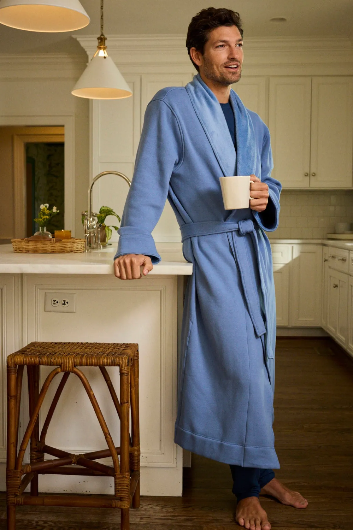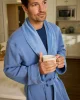 The Men’s Cozy Robe in Mystic Blue, a solid, faded indigo, features a pleasantly heavy weight with a turndown collar, sewn-in belt, and roomy pockets. It’s lined in fleece with a soft cotton jersey exterior.