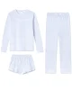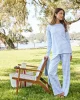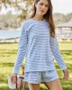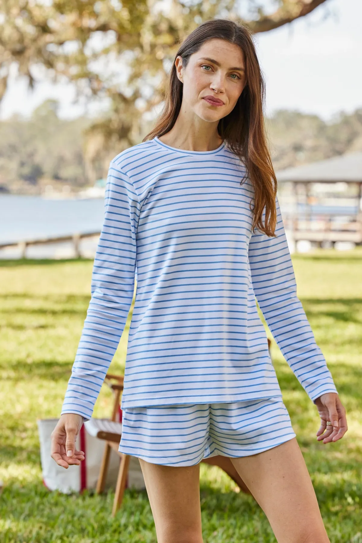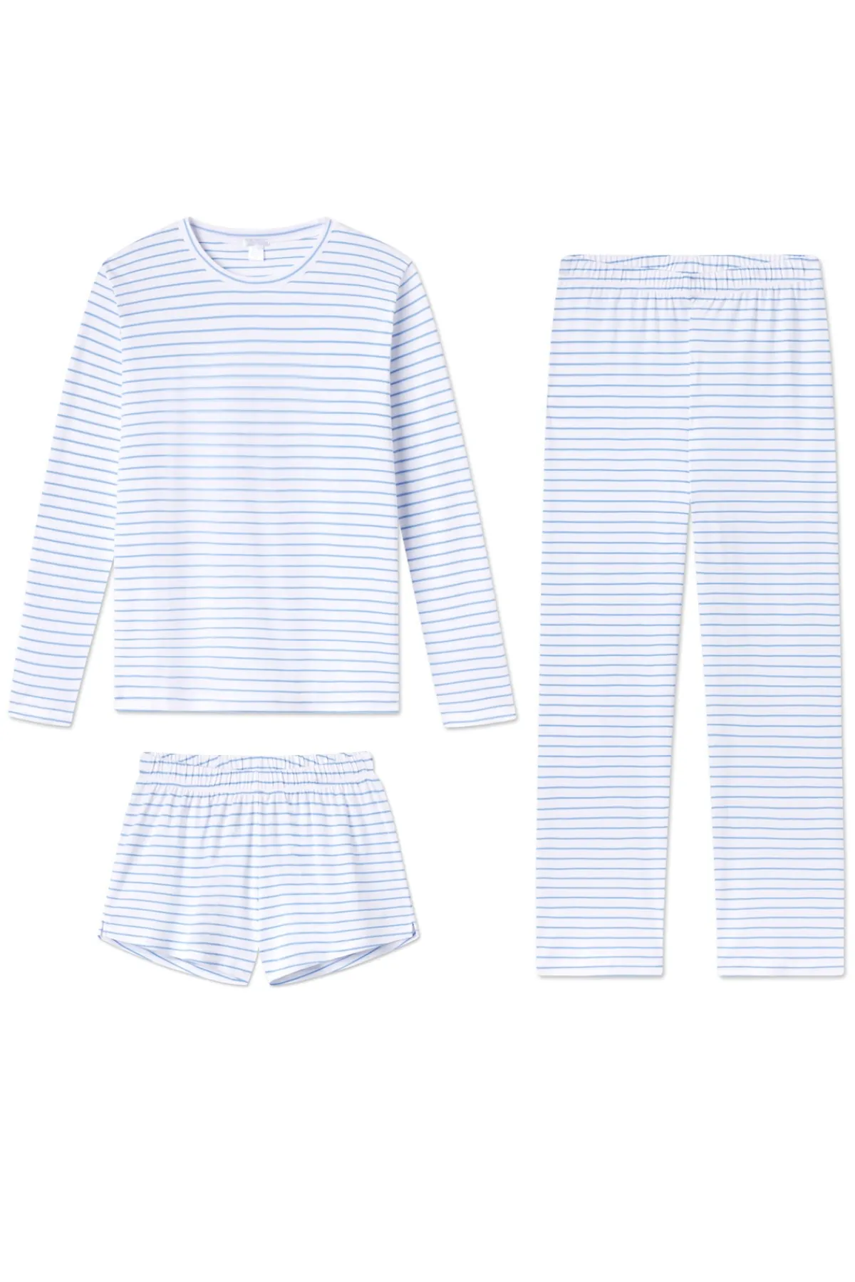 The Long Sleeve Crew Bundle in Baltic Blue,cornflower blue stripes set on white, features a fitted, long sleeve crewneck top. The pants and shorts are high-waisted with an elastic waist and straight-edge hem. Made from 100% Pima cotton.