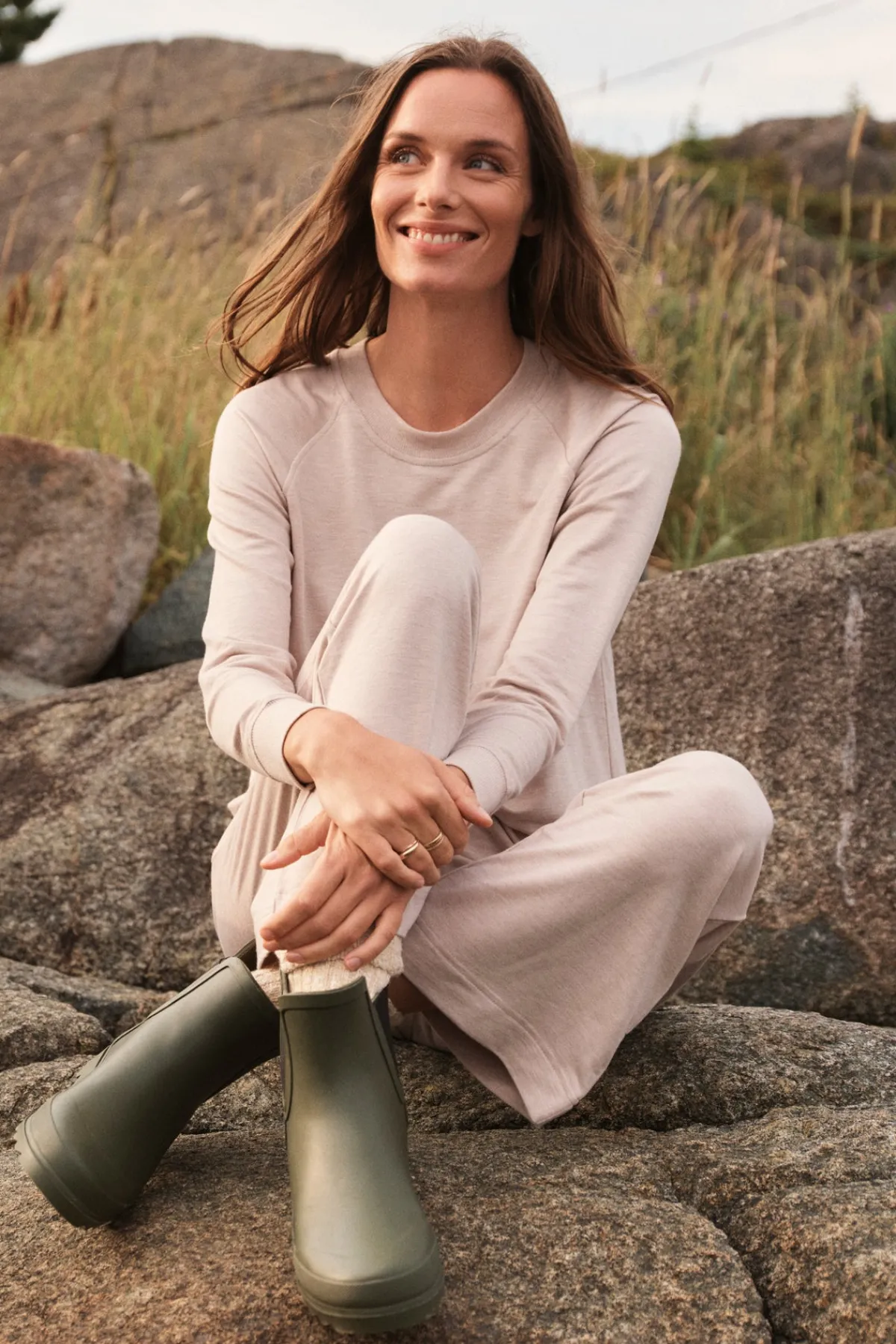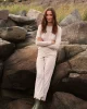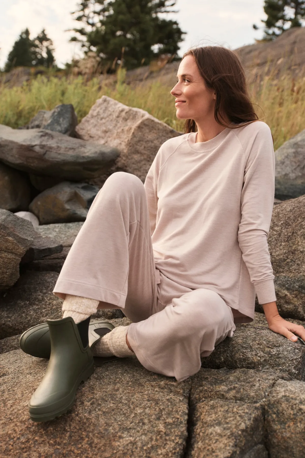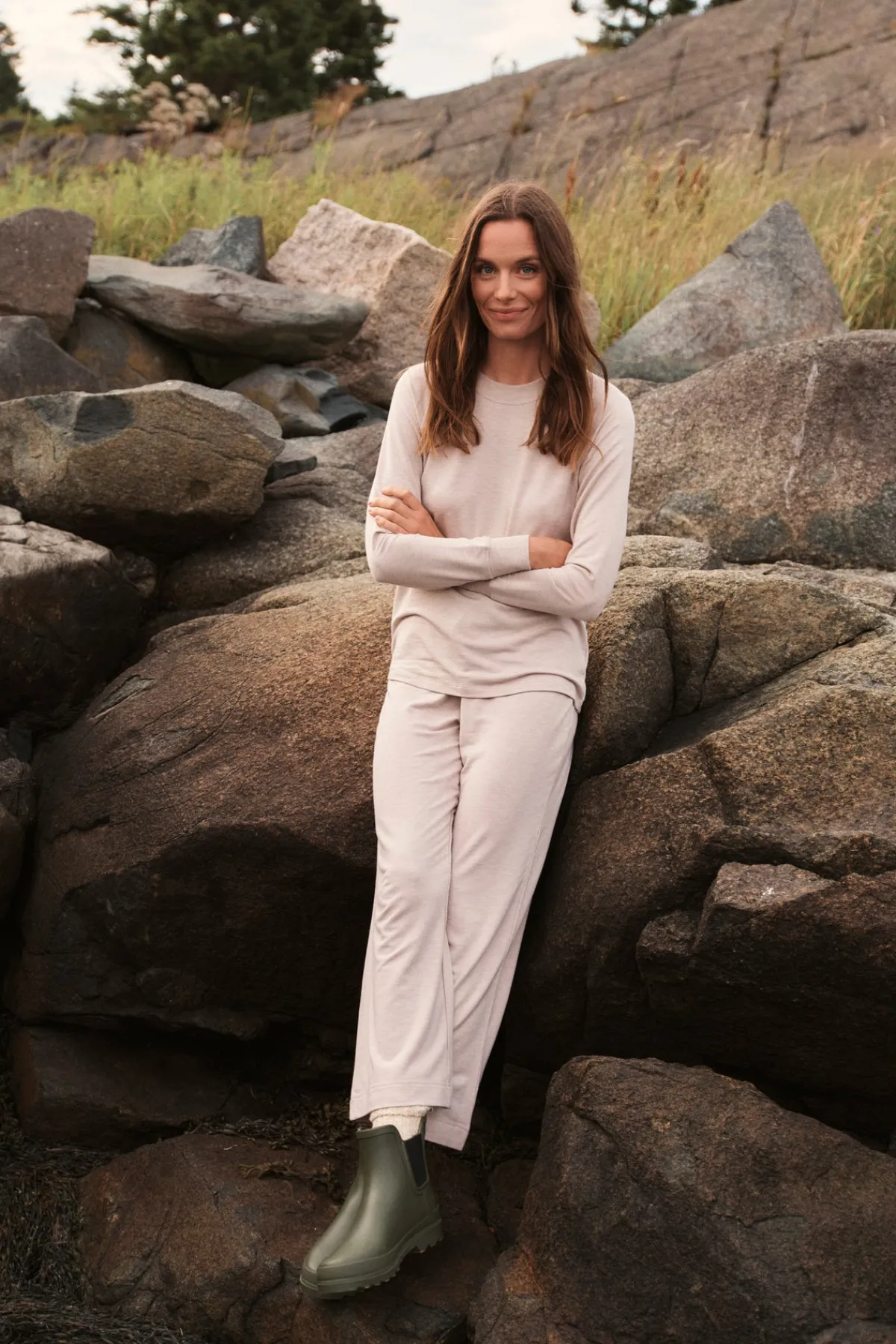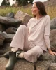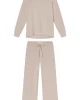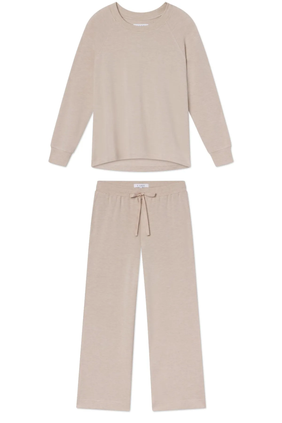 The Relax Pants Set in Oat Heather, a heathered light taupe, features a raglan crewneck sweatshirt with ribbed cuffs. The coordinating cropped, wide-leg pants have an elastic waistband and functional grosgrain ribbon tie. Buttery soft with just enough structure, this lounge set is our favorite to put on at the end of the day. Made of 95% modal, 5% spandex.