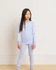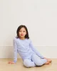 Our enhanced kids styles feature a ribbed, cotton-spandex collar and cuffs for a comfortable, easy-on fit. The Kids Long-Long Set in Hydrangea, our best-selling purpley-blue, features a long-sleeve top and pants with an elastic waistband. Made from 100% Pima cotton. This garment is not flame resistant. For the child’s safety, this garment should fit snugly.