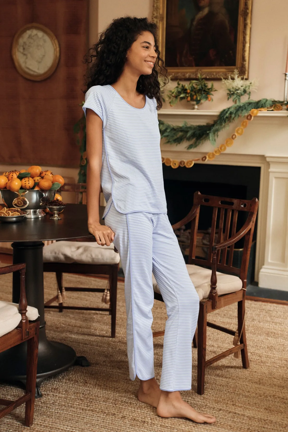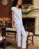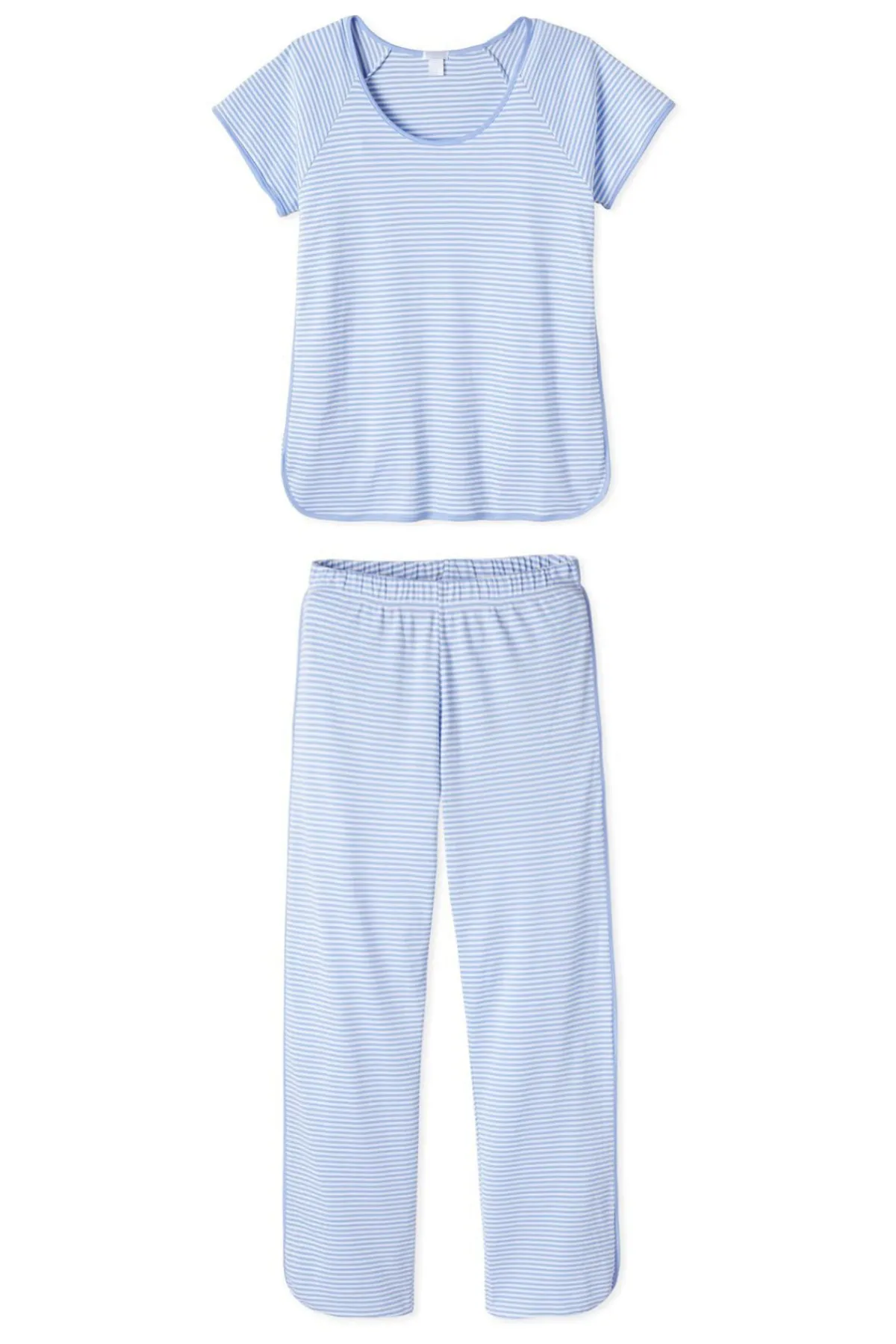 The Pima Classic Short-Long Set in Hydrangea, our best-selling purpley-blue, features a scoop neck, short-sleeve top and pants with a dolphin hem and elastic waistband. This soft, breathable pajama pants set has contrast piping throughout. Made from 100% Pima cotton.