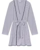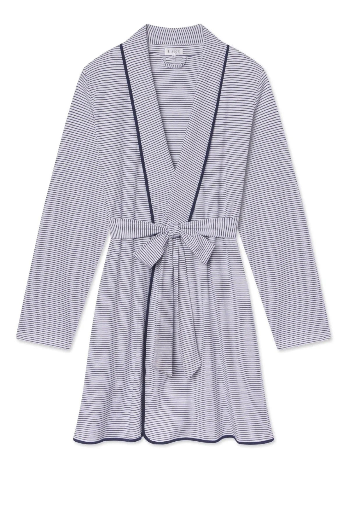 The Pima Short Robe in English Navy Stripe, a fine, horizontal navy and white stripe, features long sleeves, a sewn-in belt, and side pockets. Made from 100% Pima cotton.