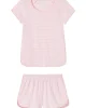 The Pima Classic Shorts Set in English Rose Stripe, a subtly warm pink stripe set on white, features a scoop neck, short-sleeve top and shorts with a dolphin hem and elastic waistband. This soft, breathable pajama shorts set has contrast piping throughout. Made from 100% Pima cotton.