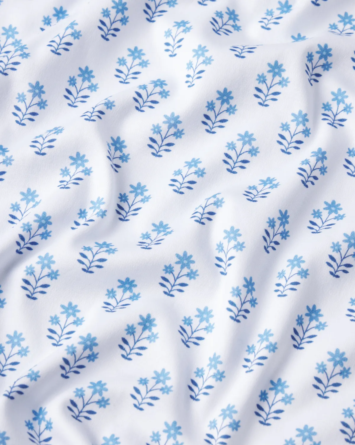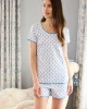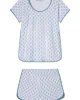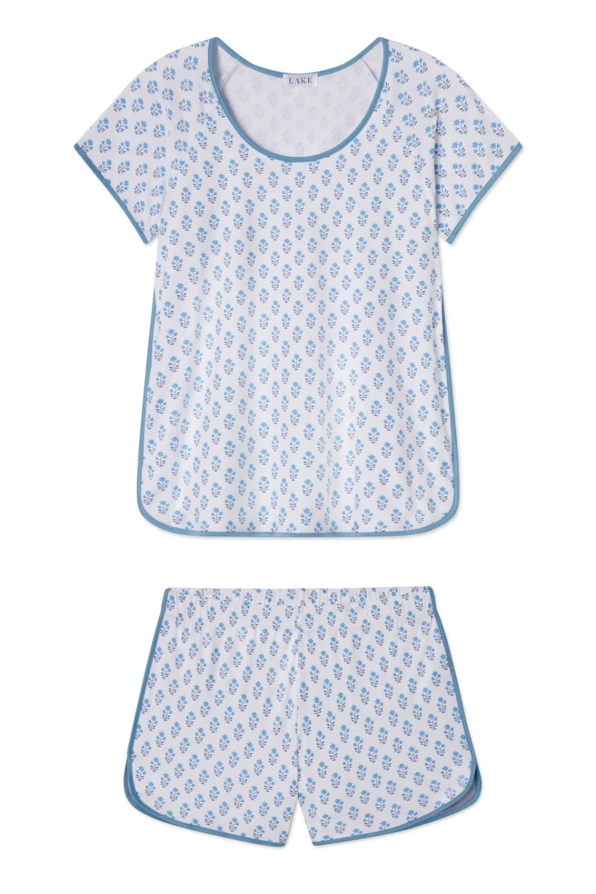 The Pima Classic Shorts Set in Serene Blue Inverse Posy, petite, soft blue bouquets set on white,features a scoop neck, short-sleeve top and shorts with a dolphin hem and elastic waistband. This soft, breathable pajama shorts set has contrast piping throughout. Made from 100% Pima cotton.