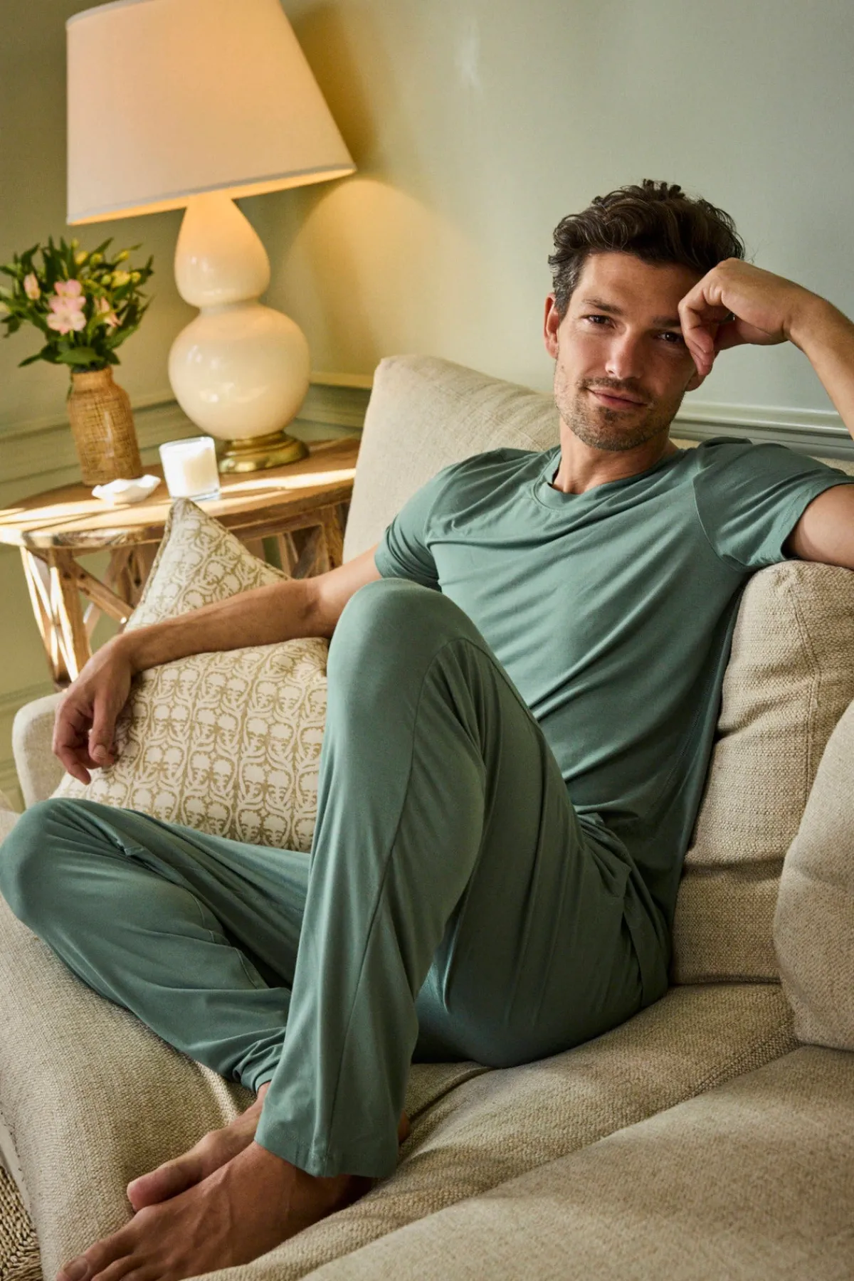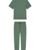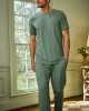 The Menโs Bamboo Set in Fairway Green, a deep, muted gray-green, streamlines his sleep in highly breathable bamboo. This coordinating set pairs a short-sleeve tee with straight-leg pants featuring an elastic waistband, functional drawstring, side-slant pockets, and a faux fly. Made from 100% bamboo.