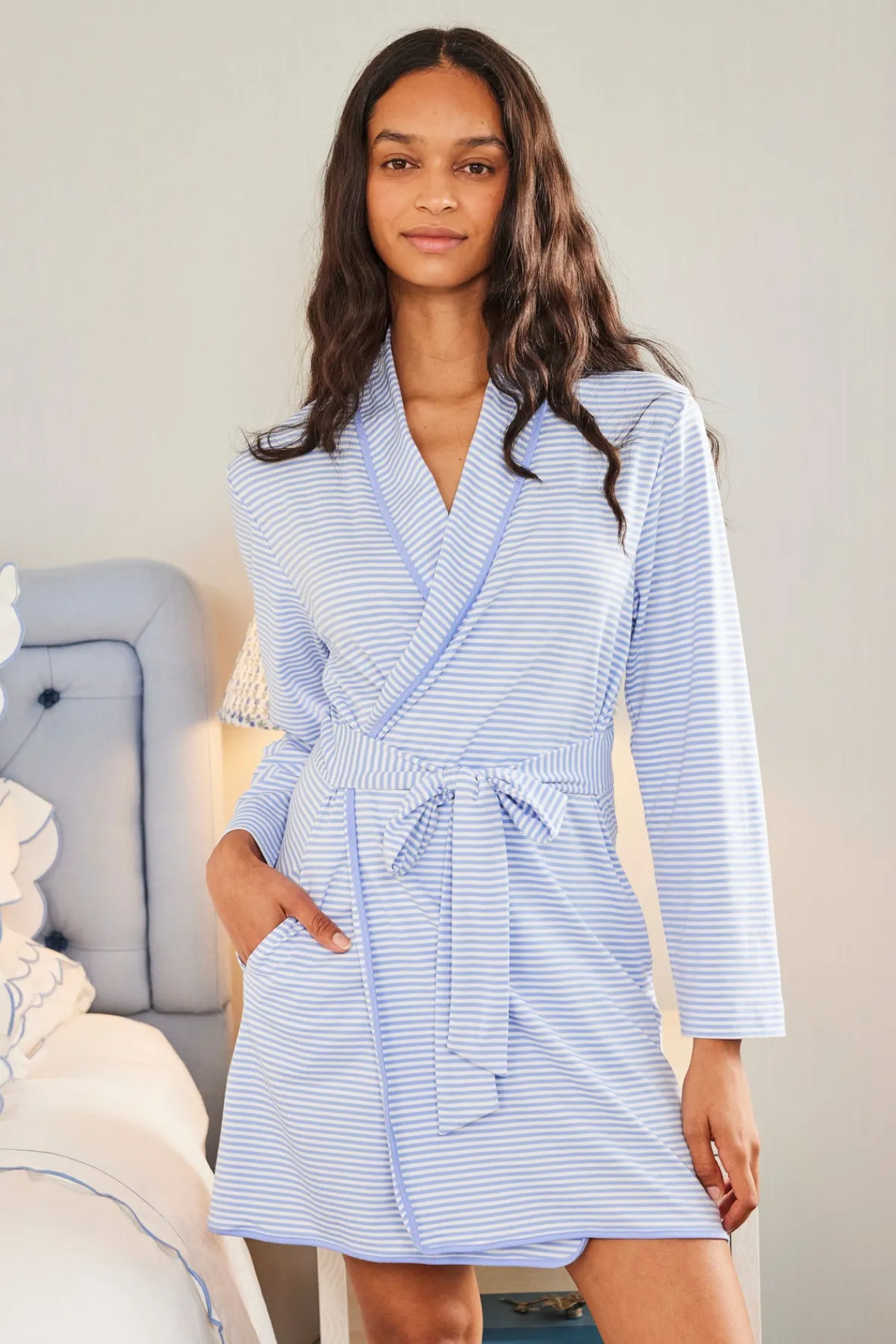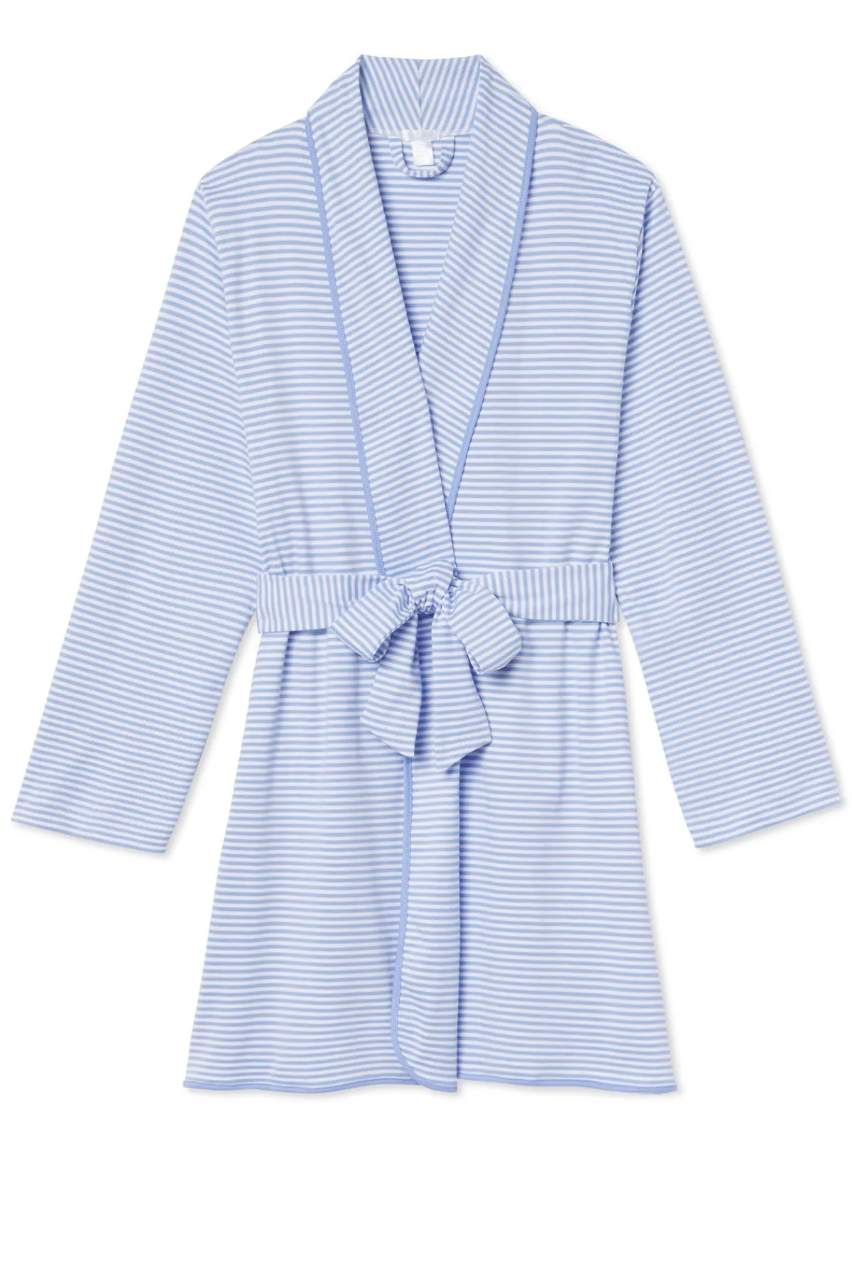 The Pima Short Robe in Hydrangea, our best-selling purpley blue, features long sleeves, a sewn-in belt, and side pockets. Made from 100% Pima cotton.