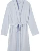 The Pima Robe in French Blue, a softstriped shade inspired by Provençal ceramics, features long sleeves, a sewn-in belt, and side pockets. Made from 100% Pima cotton.
