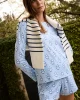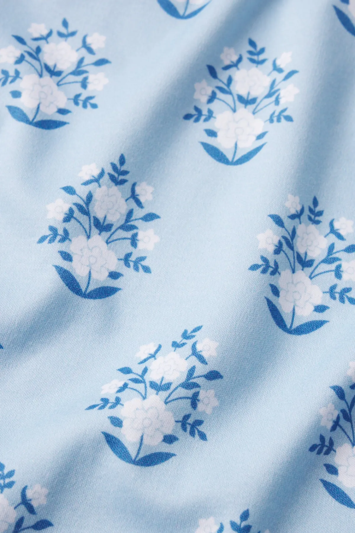 The Pima Crew Long-Short Set in French Blue Cottage Floral, a floral block print set on powder blue, features a long-sleeve crewneck top and shorts with an elastic waistband and 3″ inseam. Made from 100% Pima Cotton.