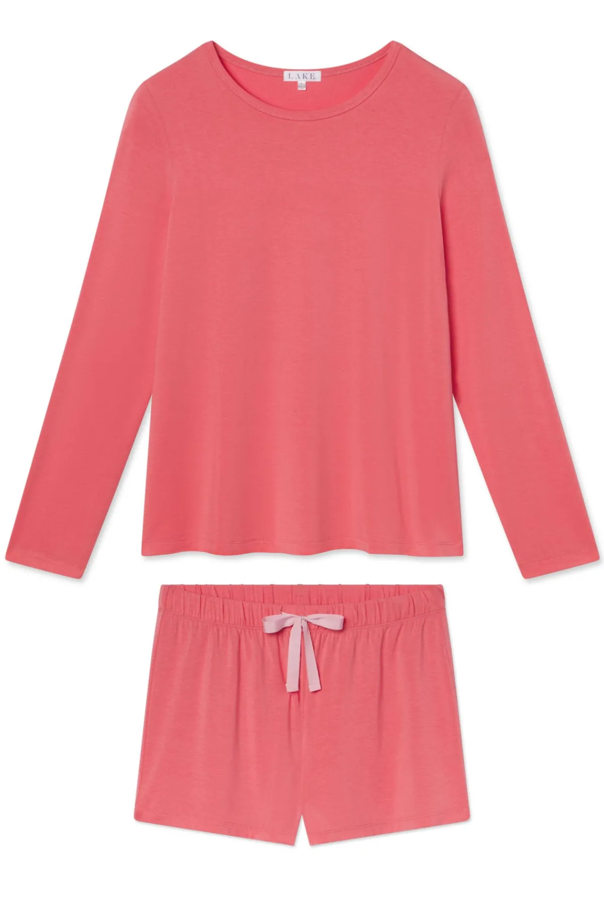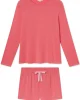 The DreamModal™ Ribbon Long-Short Set in Winterberry, a muted pink, pairs a long-sleeve crewneck top with drawstring pajama shorts that feature a contrasting ribbon tie. Made of 95% modal, 5% spandex.
