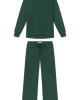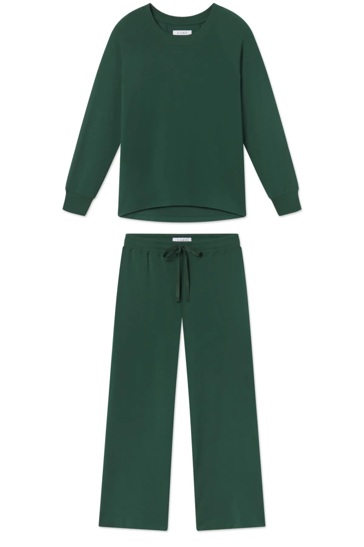 The Relax Pants Set in Trekking Green, a rich, hunter green, features a raglan crewneck sweatshirt with ribbed cuffs. The coordinating cropped, wide-leg pants have an elastic waistband and functional grosgrain ribbon tie. Buttery soft with just enough structure, this lounge set is our favorite to put on at the end of the day. Made of 95% modal, 5% spandex.