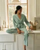 The DreamModal™ Kimono Pajama Set in Boxwood Vertical Stripe, a soft, cool green with white stripes, features a wrap top with wide, bell sleeves and full-length pants with a wide leg and elastic waistband. The wrap silhouette and generous proportions are also nursing-friendly for moms and moms-to-be. Made of 95% modal, 5% spandex.