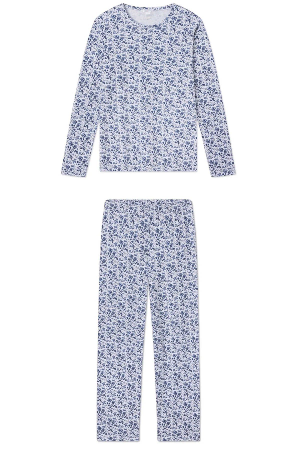 The Pima Crew Long-Long Set in Sea Depth Garden Floral,a lively floral pattern in shades of deep indigo, features a canโt-go-wrong long sleeve crewneck and pants with straight hems throughout. Itโs easy to embrace this understated pajama style, previously known as our Weekend Set. Go ahead and join the Crew. Made from 100% Pima cotton.