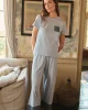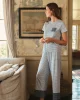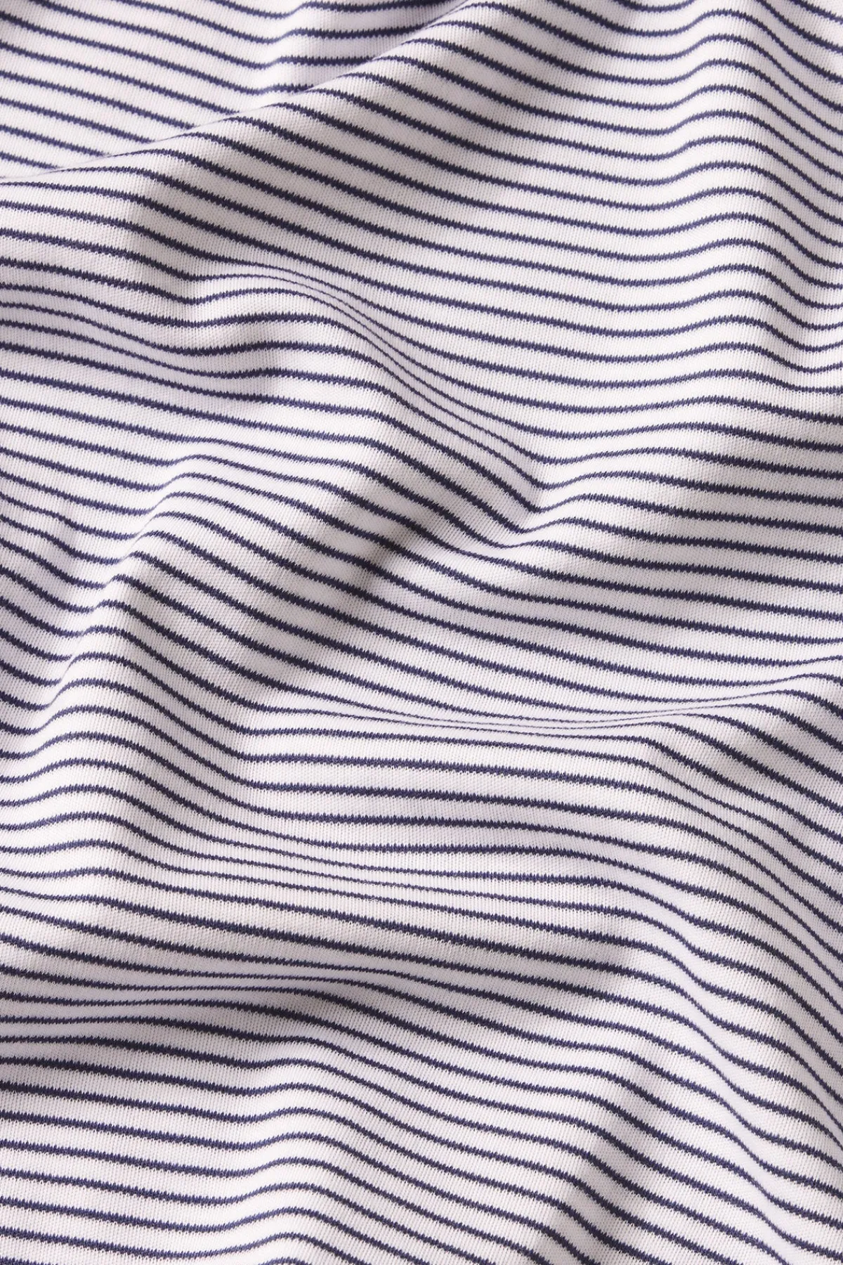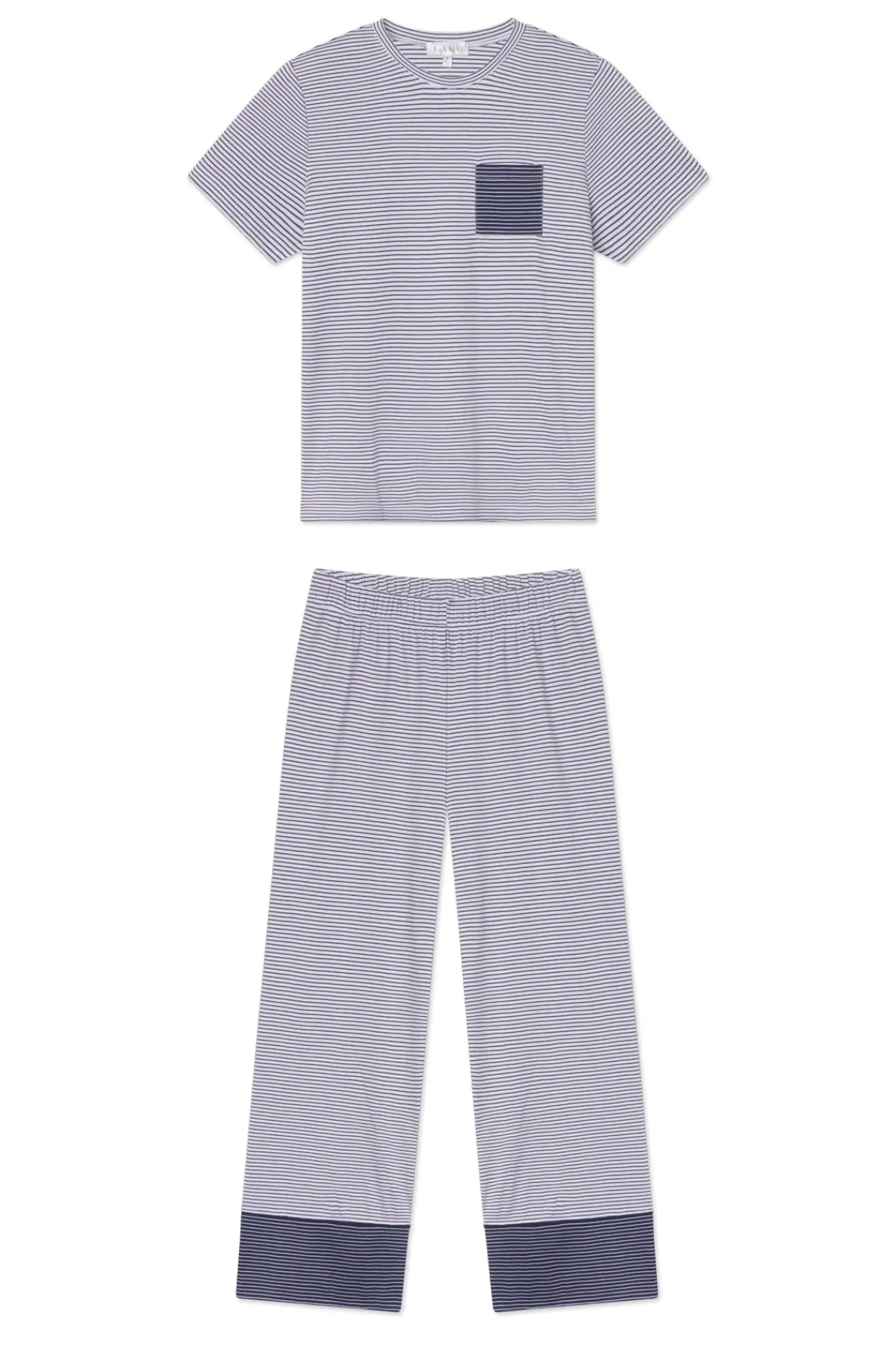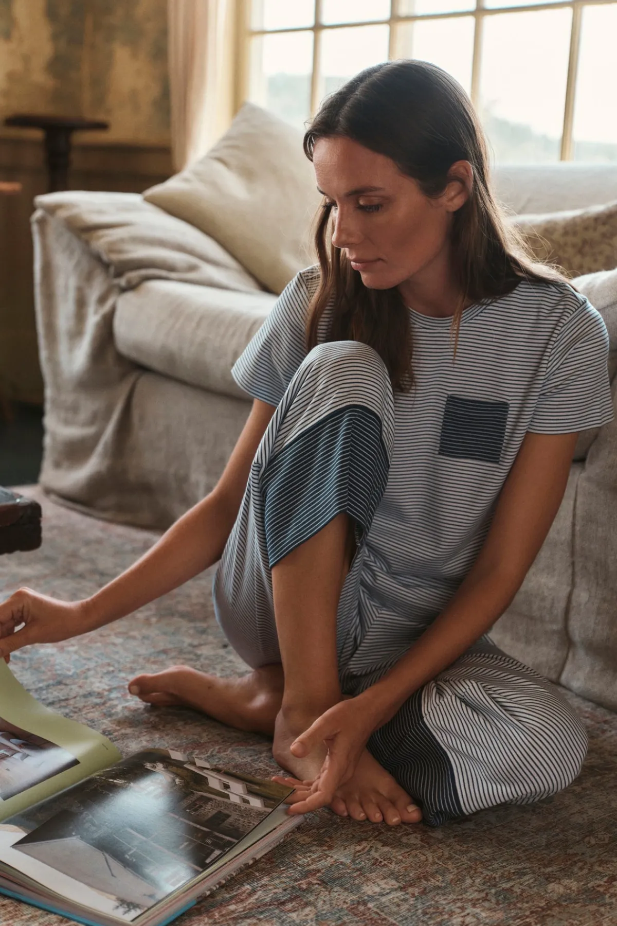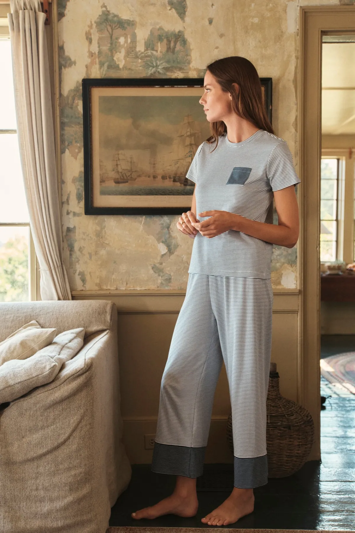 The Pima Crew Wide Leg Pajama Set in English Navy Stripe, a fine, horizontal navy and white stripe, features a fitted short-sleeve crewneck top with cropped, wide-leg pants with an elastic waistband. A contrast chest pocket and pant cuff add an eye-catching twist. Made from 100% Pima cotton.
