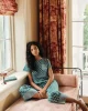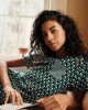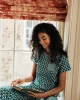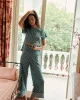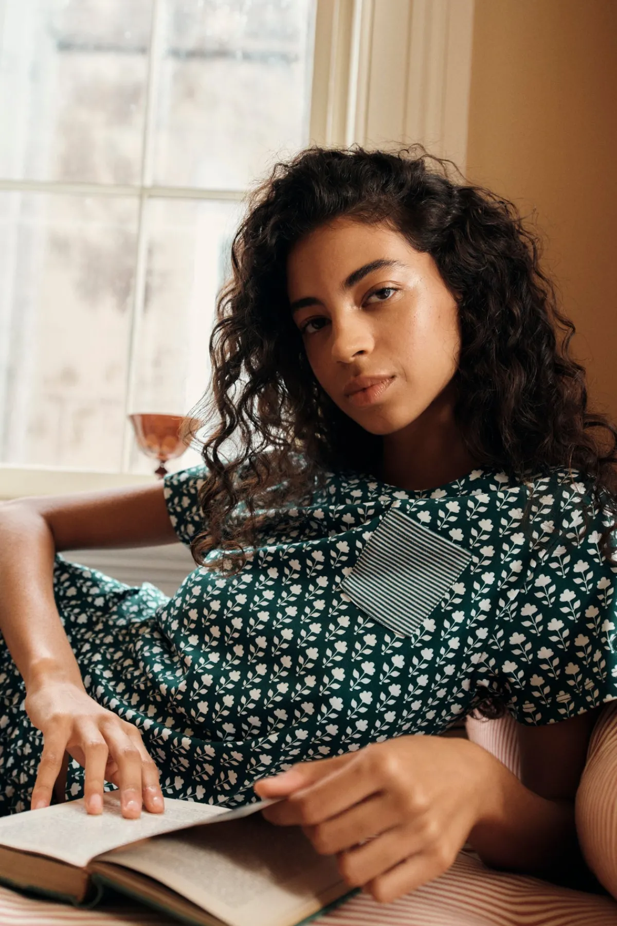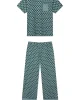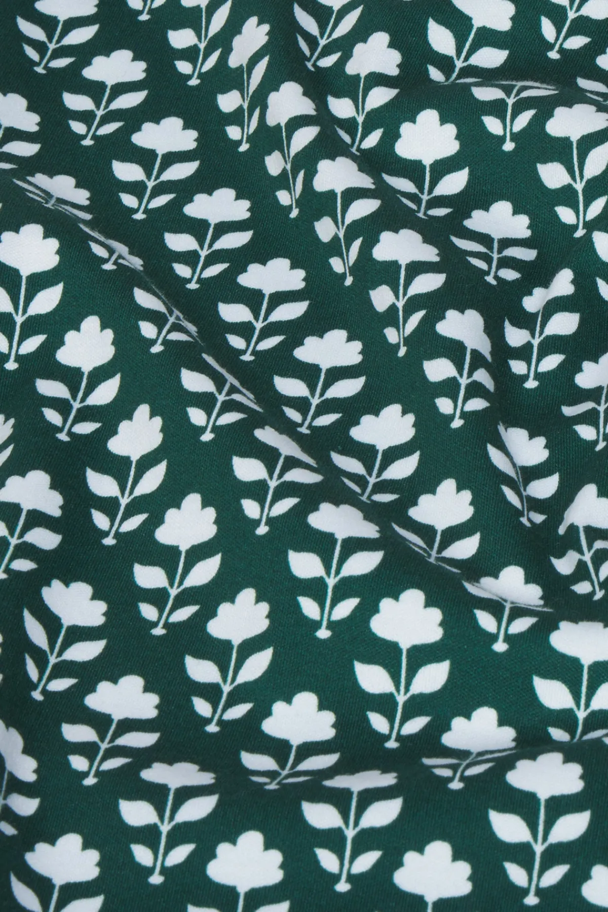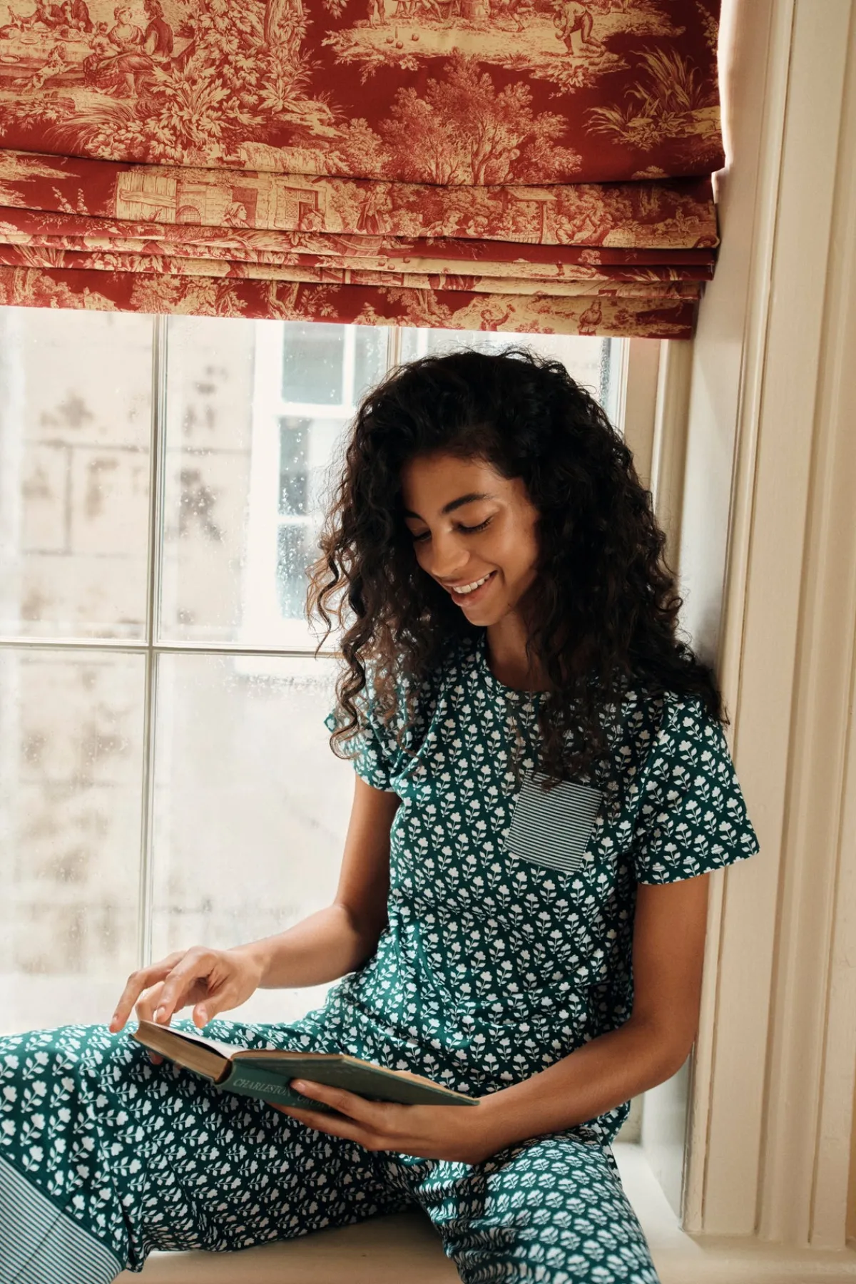 The Pima Crew Wide Leg Pajama Set in Frasier Bloom,a crisp floral motif set on deep green with playful striped accents, features a fitted short-sleeve crewneck top with cropped, wide-leg pants with an elastic waistband. A contrast chest pocket and pant cuff add an eye-catching twist. Made from 100% Pima cotton.