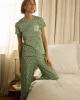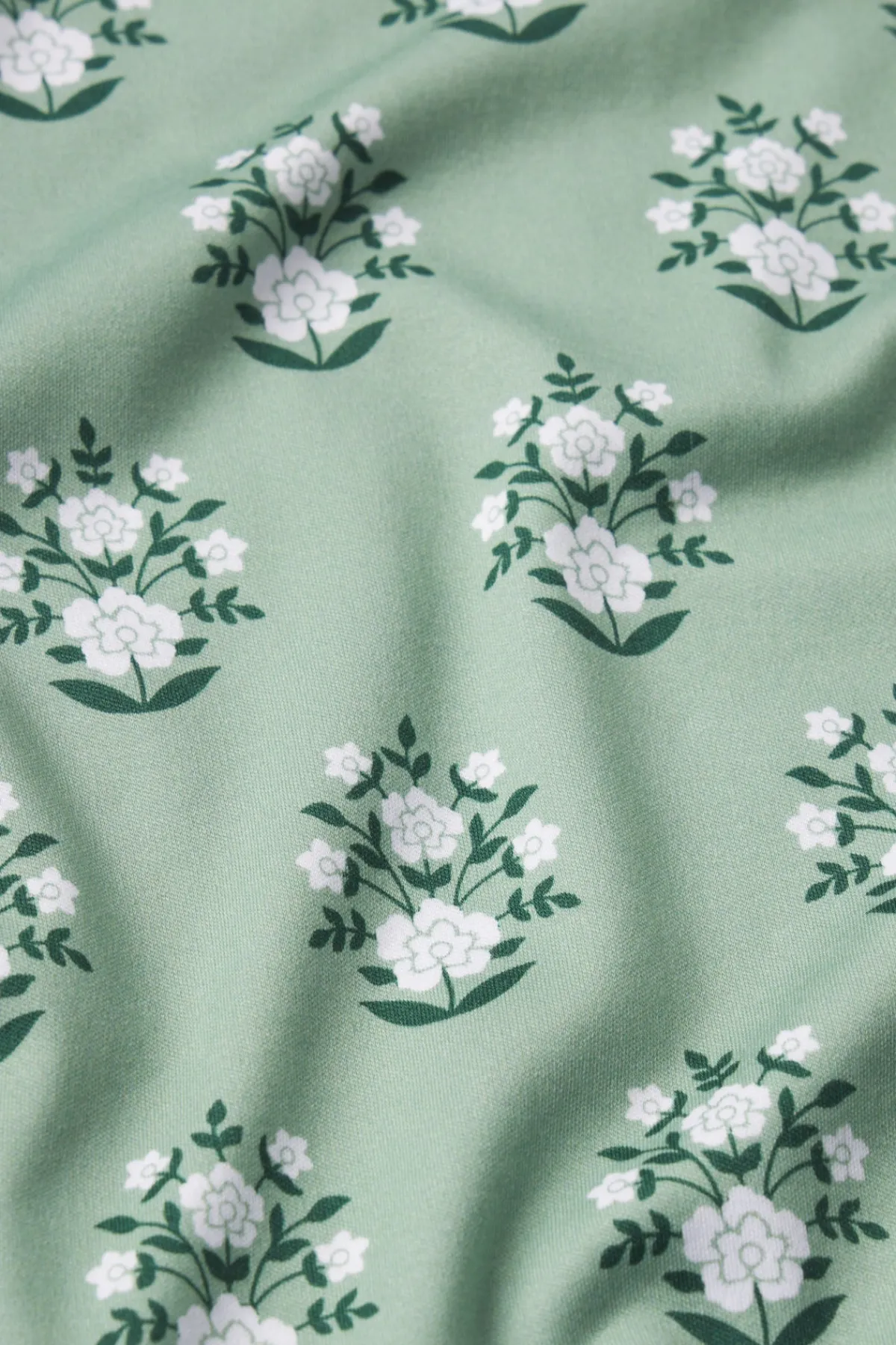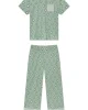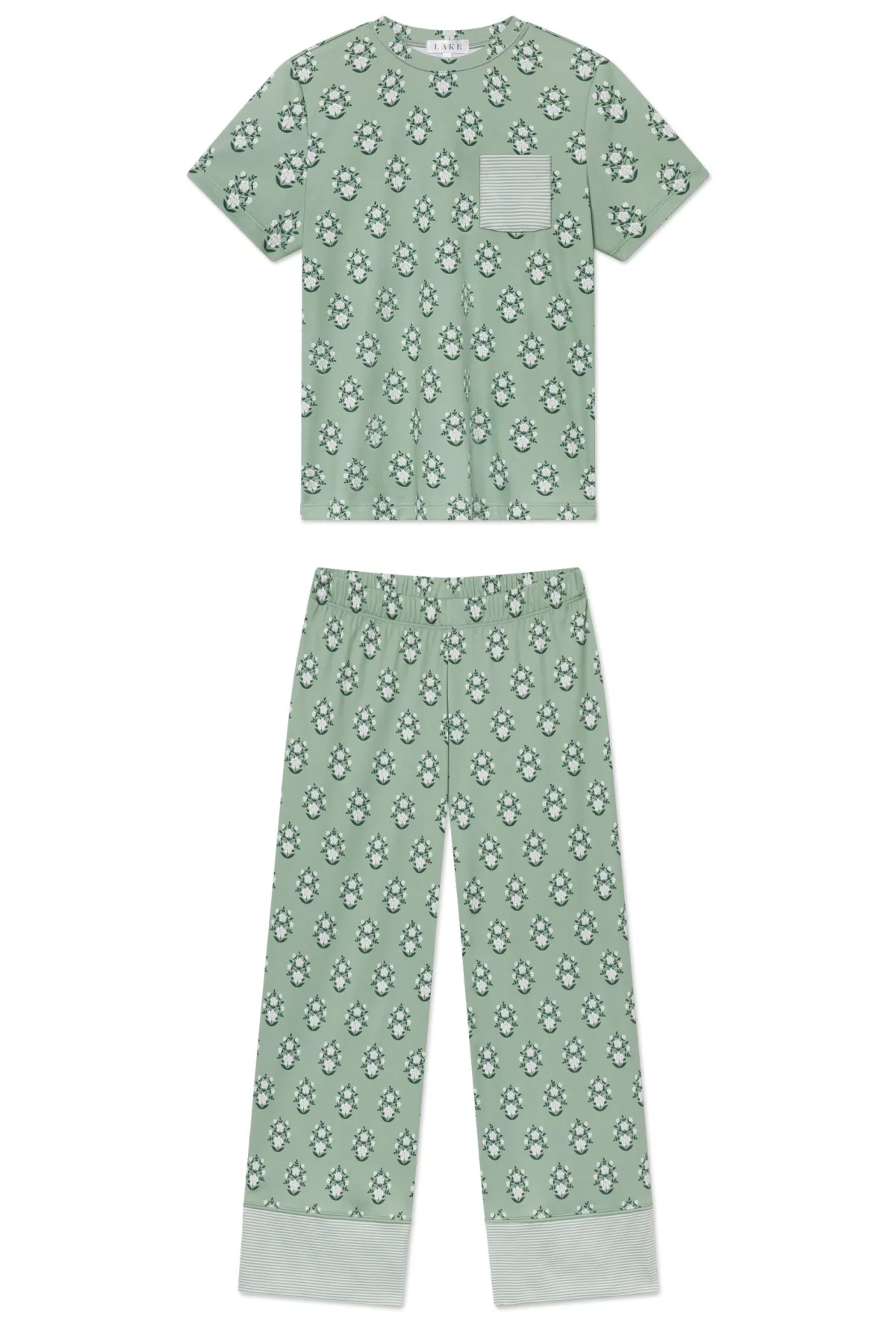 The Pima Crew Wide Leg Pajama Set in Granite Green Cottage Floral, a white and green floral block print with striped accents, features a fitted short-sleeve crewneck top with cropped, wide-leg pants with an elastic waistband. A contrast chest pocket and pant cuff add an eye-catching twist. Made from 100% Pima cotton.