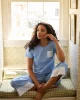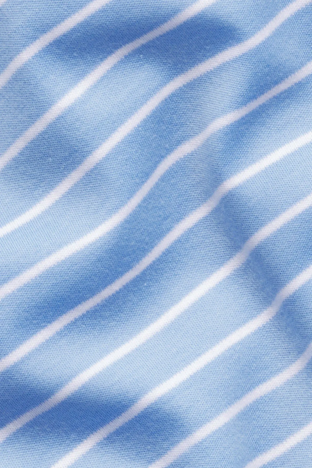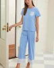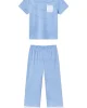 The Pima Crew Wide Leg Pajama Set in Mixed Baltic Blue Stripe, a playful palette of cornflower and white, features a fitted short-sleeve crewneck top with cropped, wide-leg pants with an elastic waistband. A contrast chest pocket and pant cuff add an eye-catching twist. Made from 100% Pima cotton.
