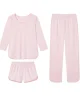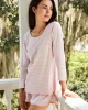 The Bundle in English Rose Stripe, a subtly warm pink stripe set on white, includes a three-quarter sleeve scoop neck top, shorts, and pants with an elastic waistband. Made from 100% Pima cotton.