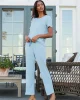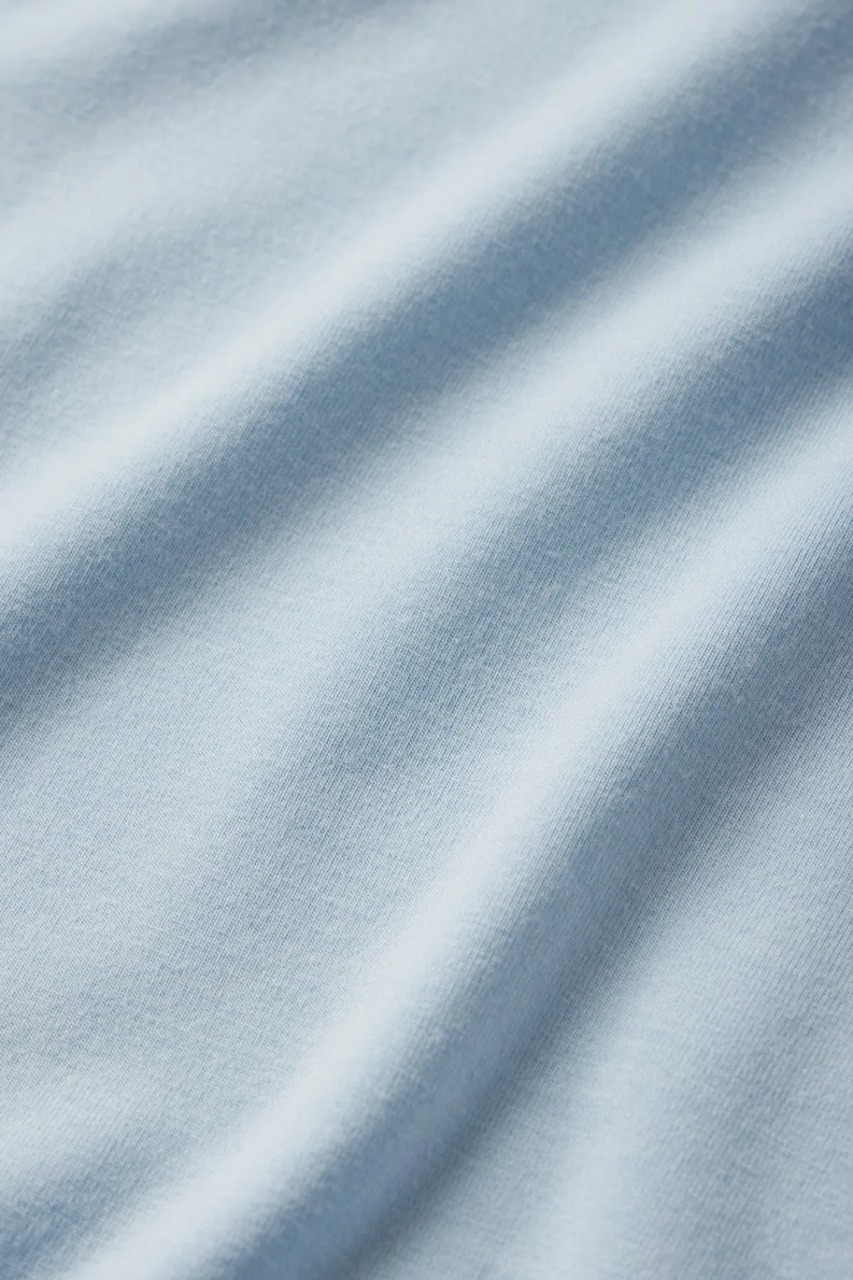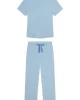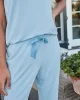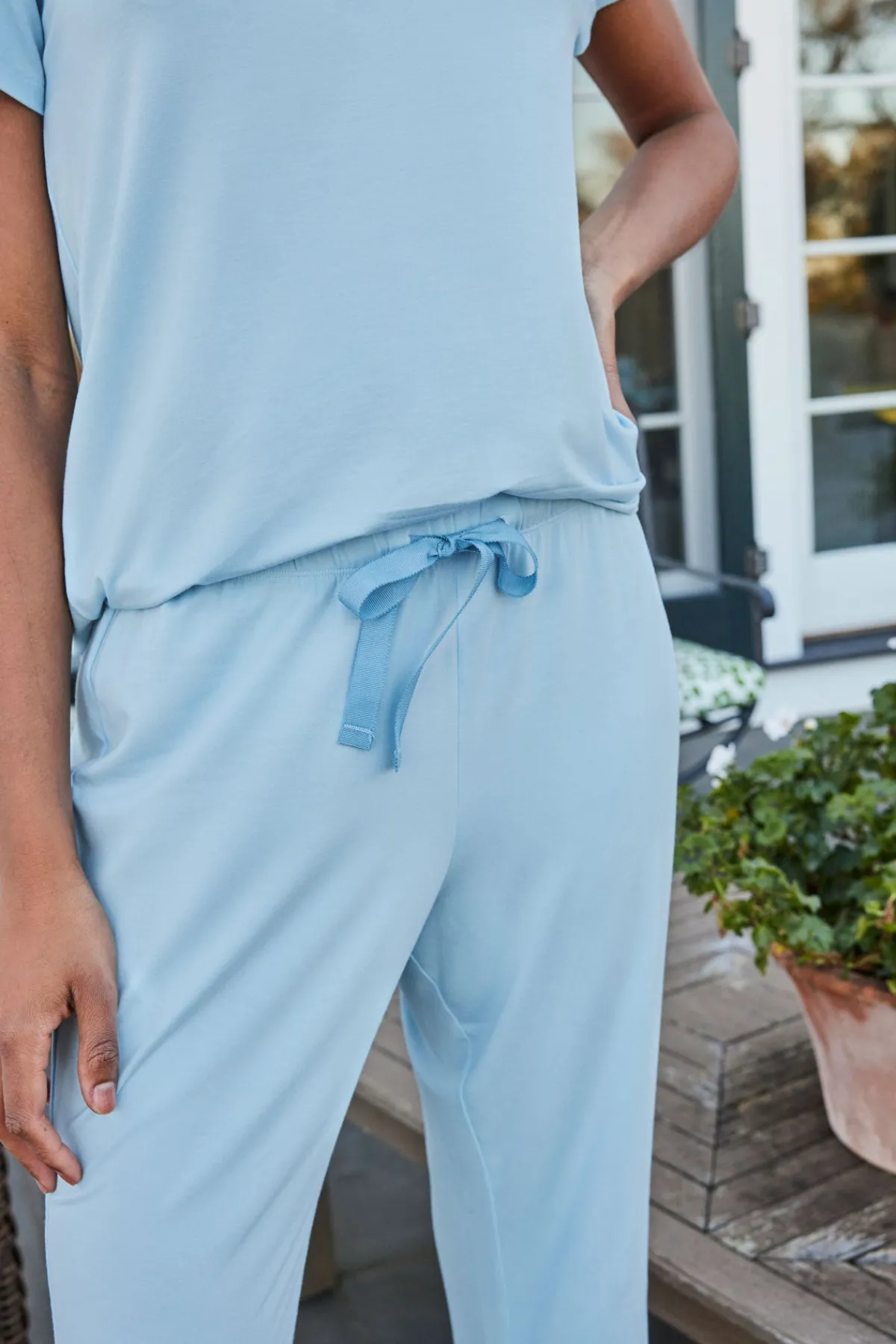 Silky soft with a fluid drape, the DreamModal™ Ribbon Short-Long Set in French Blue, a soft blue, pairs a short-sleeve crewneck top with drawstring pajama pants that feature a contrasting ribbon tie. Made of 95% modal, 5% spandex.