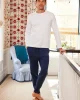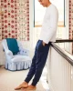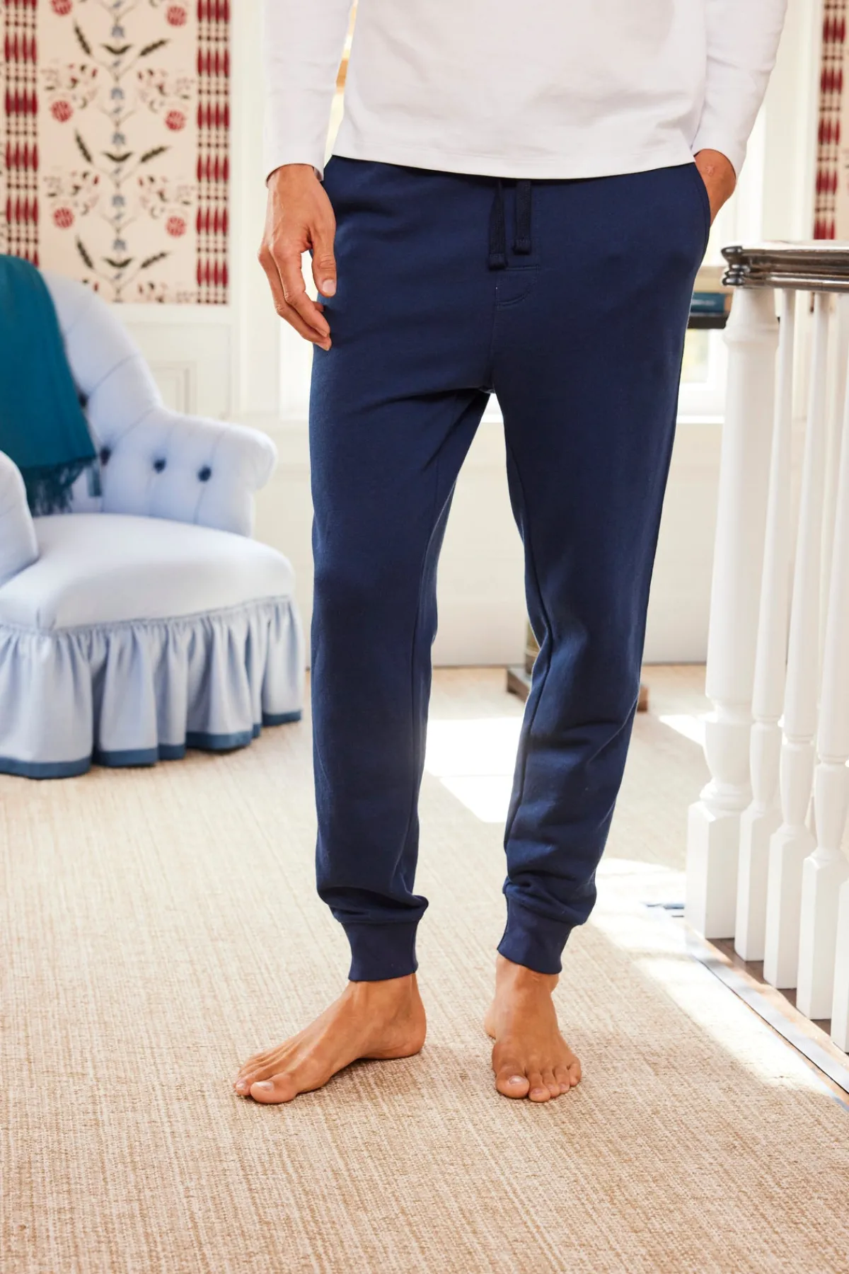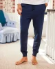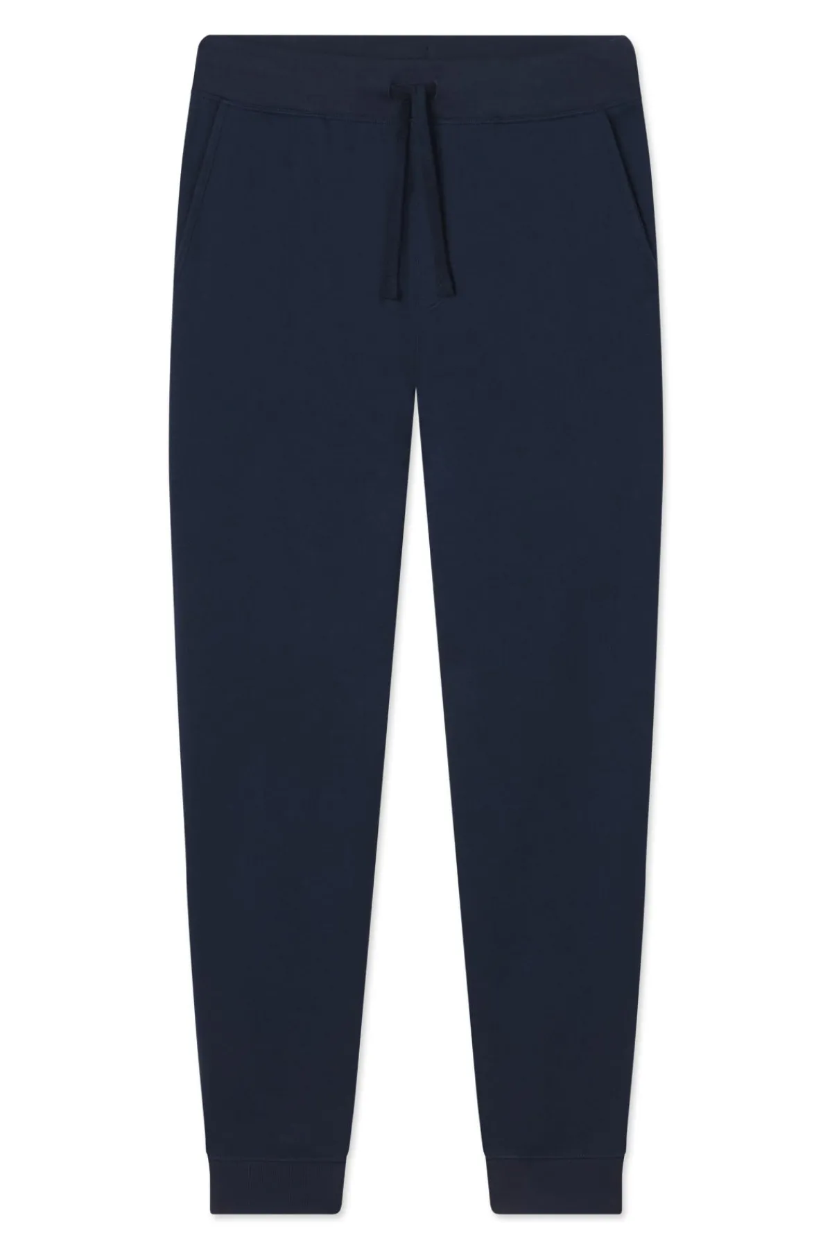 The Menโs French Terry Jogger in Deep Navy is a jogger pant with a ribbed elastic waistband and ribbed cuffs. This soft lounge pant features a functional drawstring, faux fly, side pockets, and back pockets with hidden snaps (so his phone stays secure). Made from cotton French Terry.