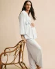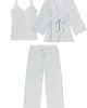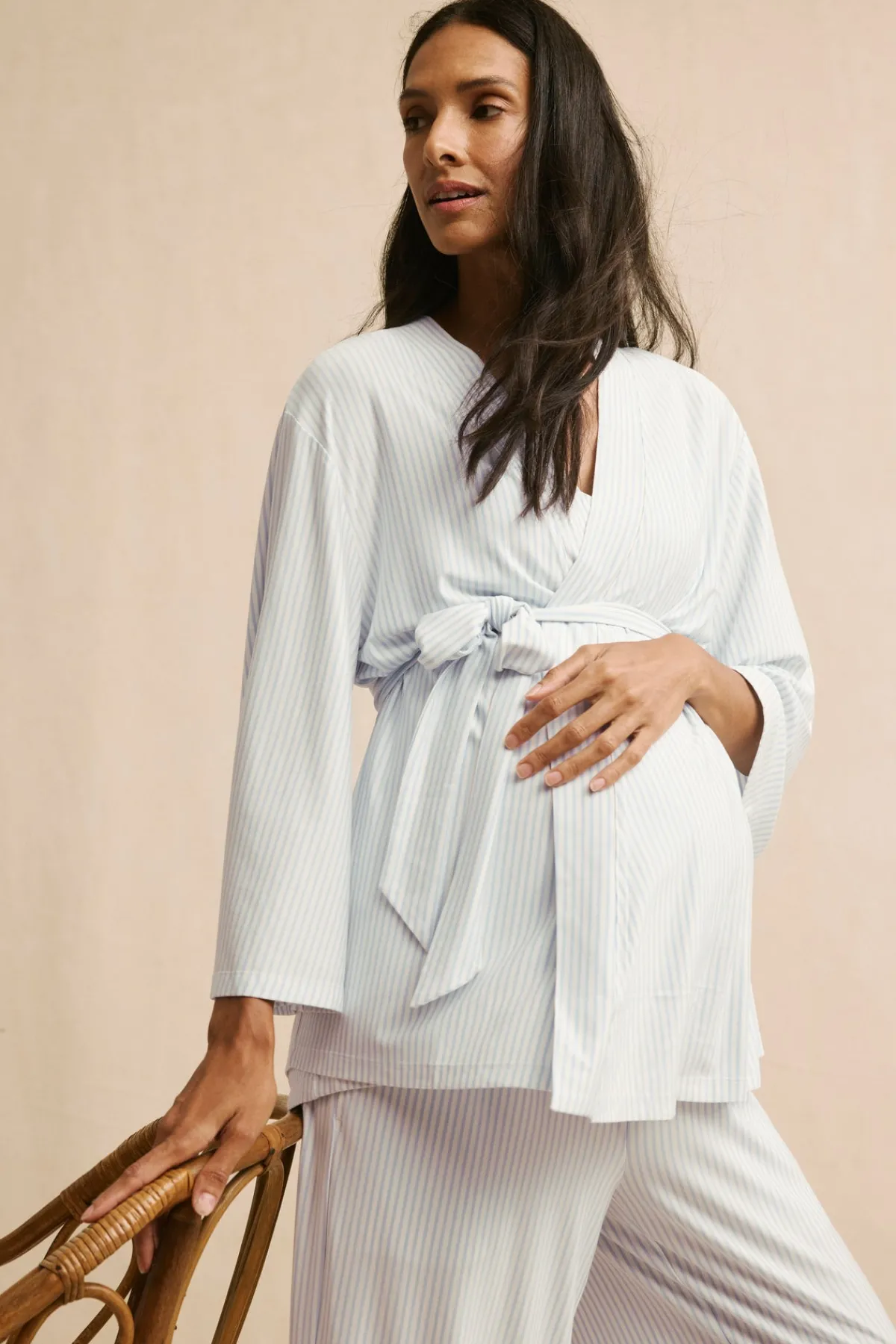 The drape and softness she loves about our Kimono Set designed specifically for moms-to-be in our signature blue-grey stripe. This three-piece set features a roomy Kimono wrap top plus a camisole with a shelf bra and adjustable, clip-down straps for easy nursing or pumping access. The pants have a wide waistband and pockets (so you’re always paci prepared).