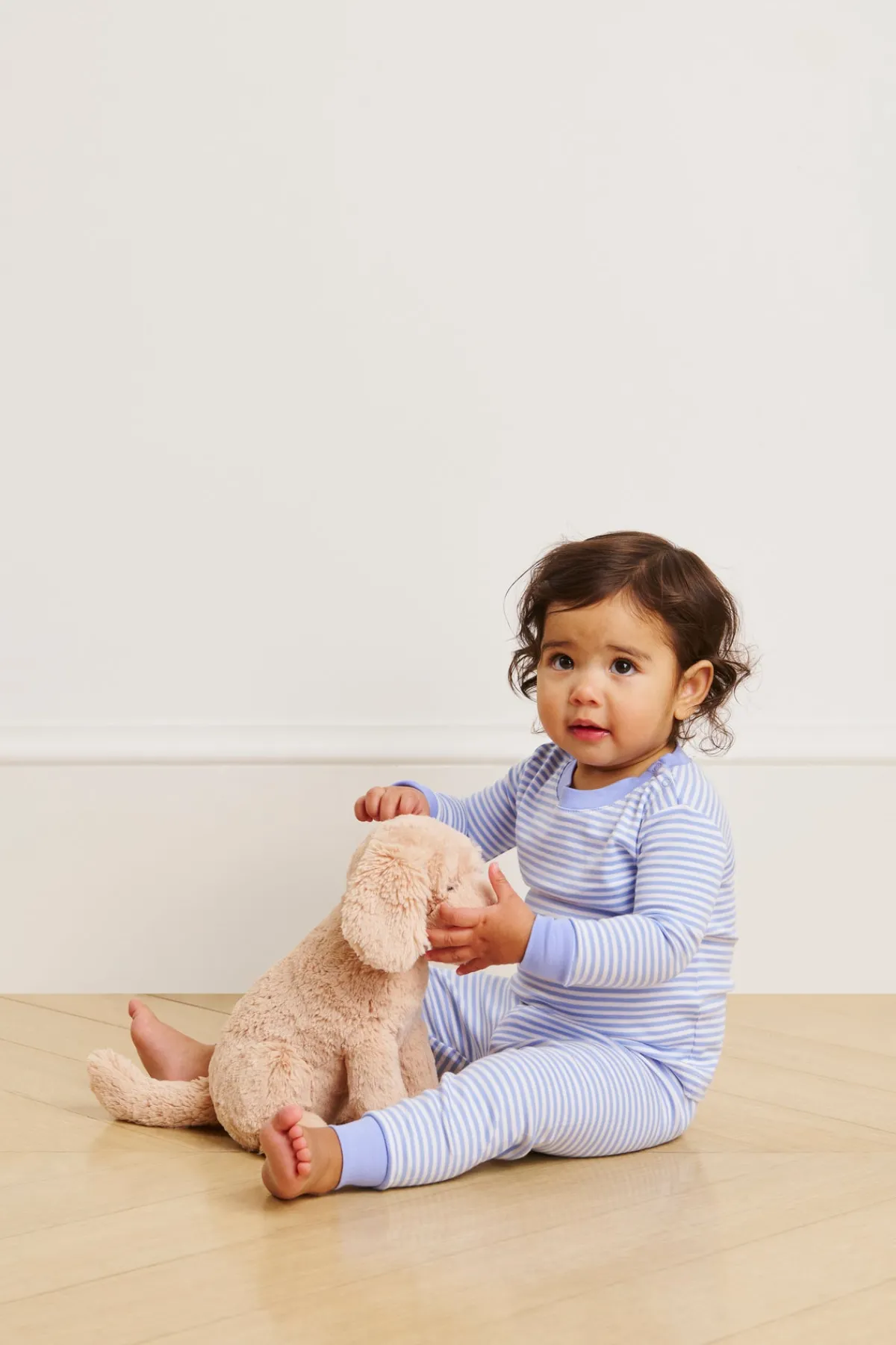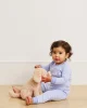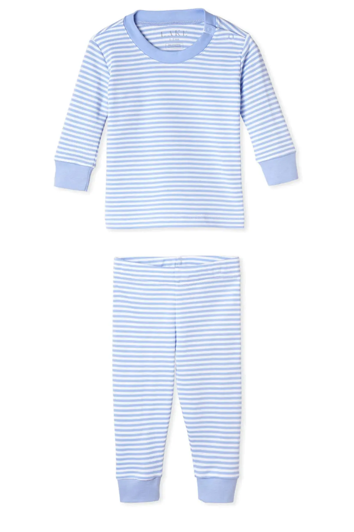 Our enhanced baby styles feature a ribbed, cotton-spandex collar and cuffs for a comfortable, easy-on fit. The Baby Long-Long Set in Hydrangea, our best-selling purpley blue, features a long-sleeve top with two functional snaps and pants with an elastic waist. Made from 100% Pima Cotton. This garment is not flame resistant. For the child’s safety, this garment should fit snugly.