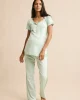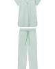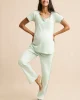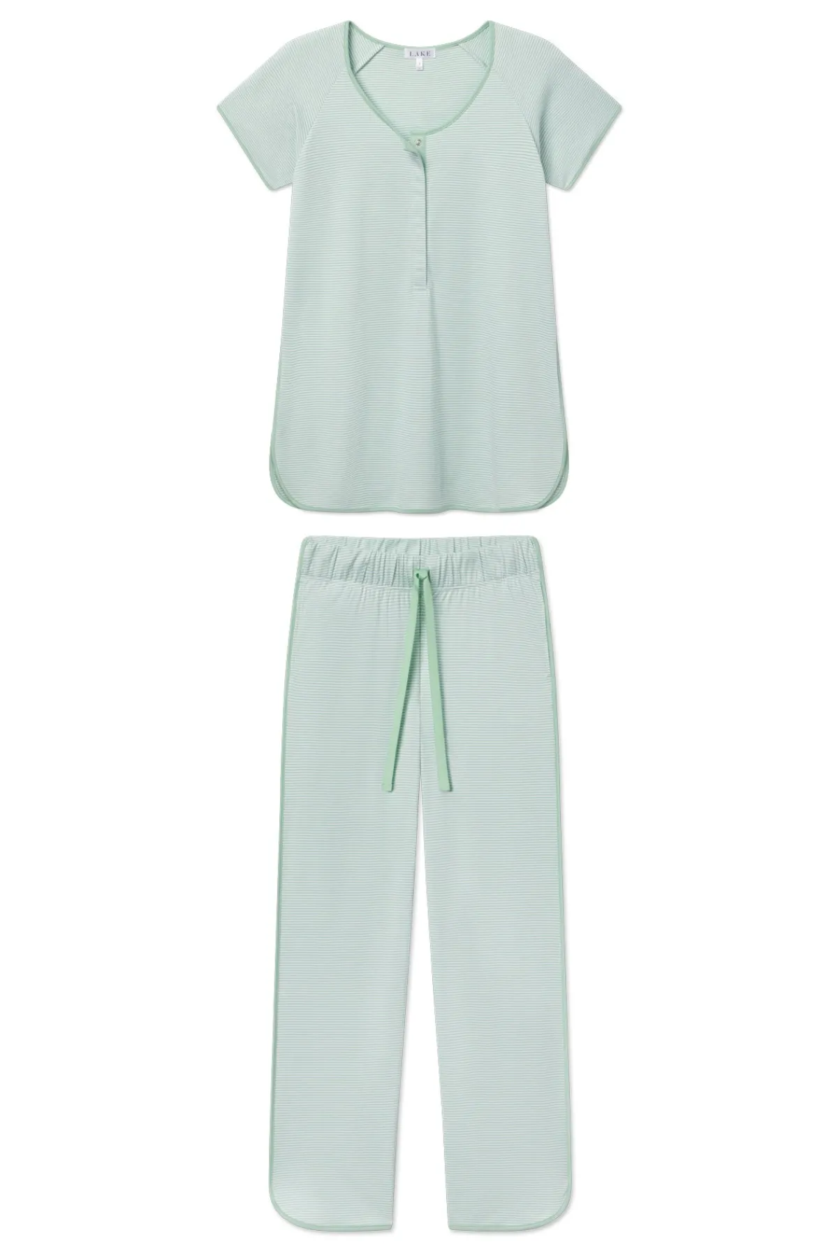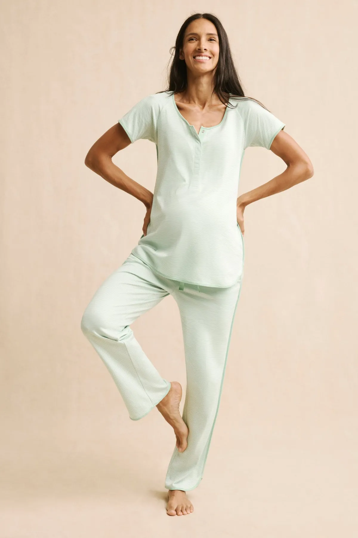 Our new, redesigned maternity styles make the waiting game more comfortable. The Maternity Pima Classic Short-Long Set in Parisian Green features a scoop neck top with a hidden snap placket for nursing or pumping, short raglan sleeves, and room for a bump. The pants have a supportive elastic waistband, drawstring, and on-seam pockets for the essentials (hi, pacifiers). This soft, breathable maternity pajama set has curved hems and contrast piping throughout. Made from 100% Pima cotton.