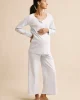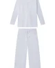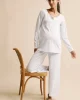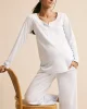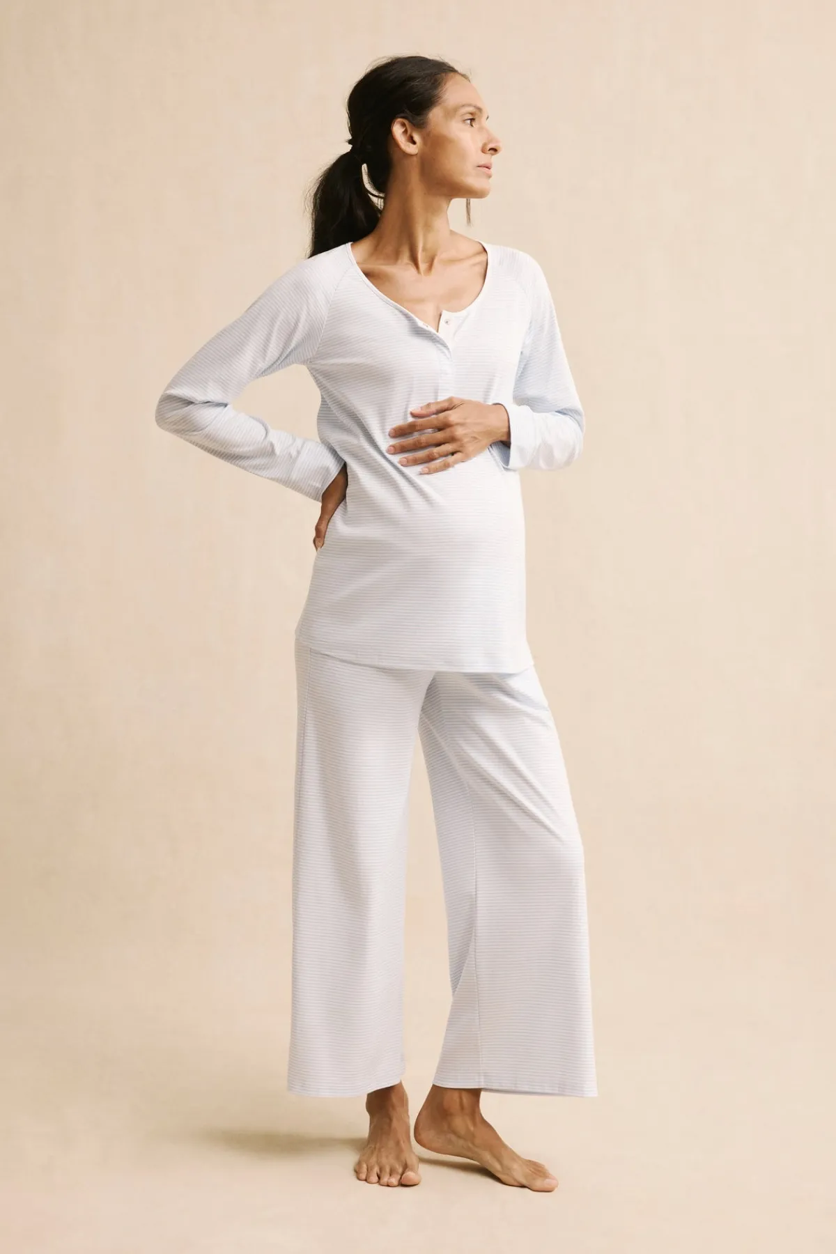 The Maternity Pima Wide-Leg Pajama Set in French Blue pairs a long-sleeve top with wide-leg, cropped pants. The top features raglan sleeves and cuffs, a hidden snap placket for nursing or pumping, and a roomier fit for a growing bump. The pants feature a functional twill tie plus scoop pockets — perfect for a phone… or a pacifier. Made from 100% Pima cotton.