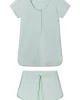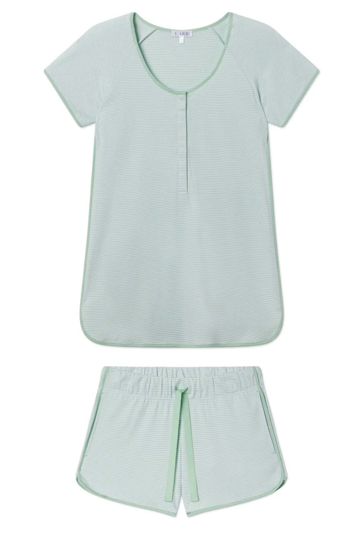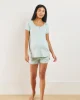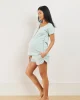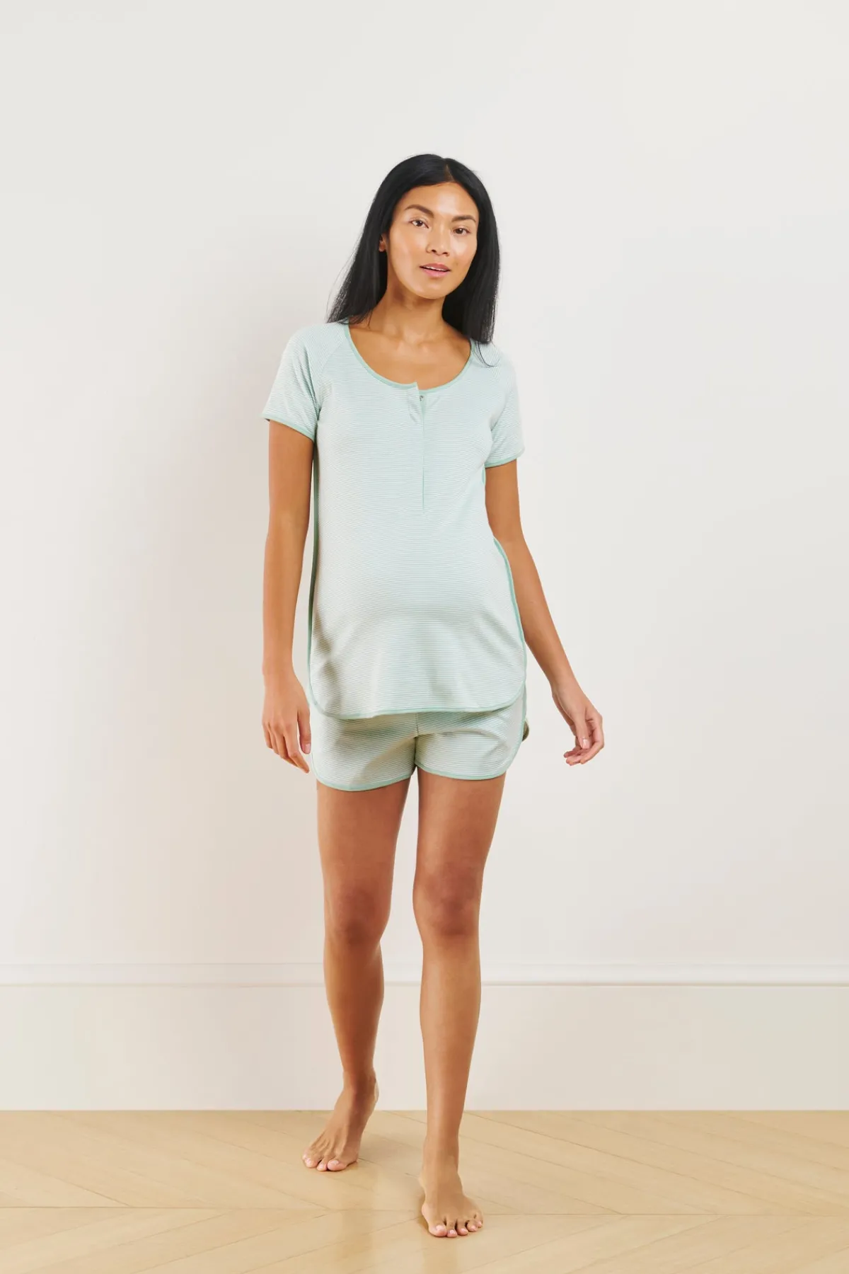 Our new, redesigned maternity styles make the waiting game more comfortable. The Maternity Pima Classic Shorts Set in Parisian Green features a scoop neck top with a hidden snap placket for nursing or pumping, short raglan sleeves, and room for a bump. The shorts have a supportive elastic waistband, drawstring, and on-seam pockets for the essentials (hi, pacifiers). This soft, breathable maternity pajama shorts set has curved hems and contrast piping throughout. Made from 100% Pima cotton.