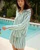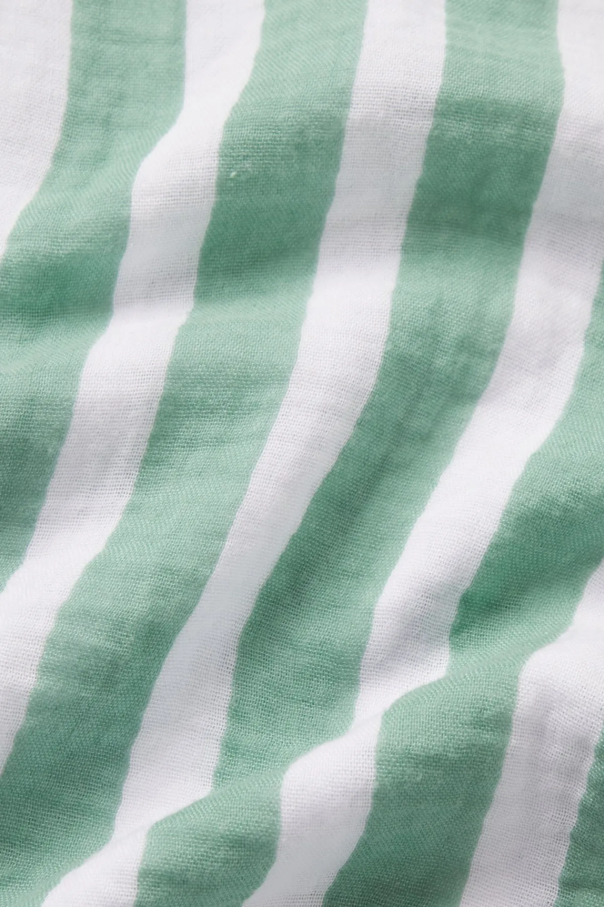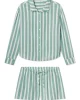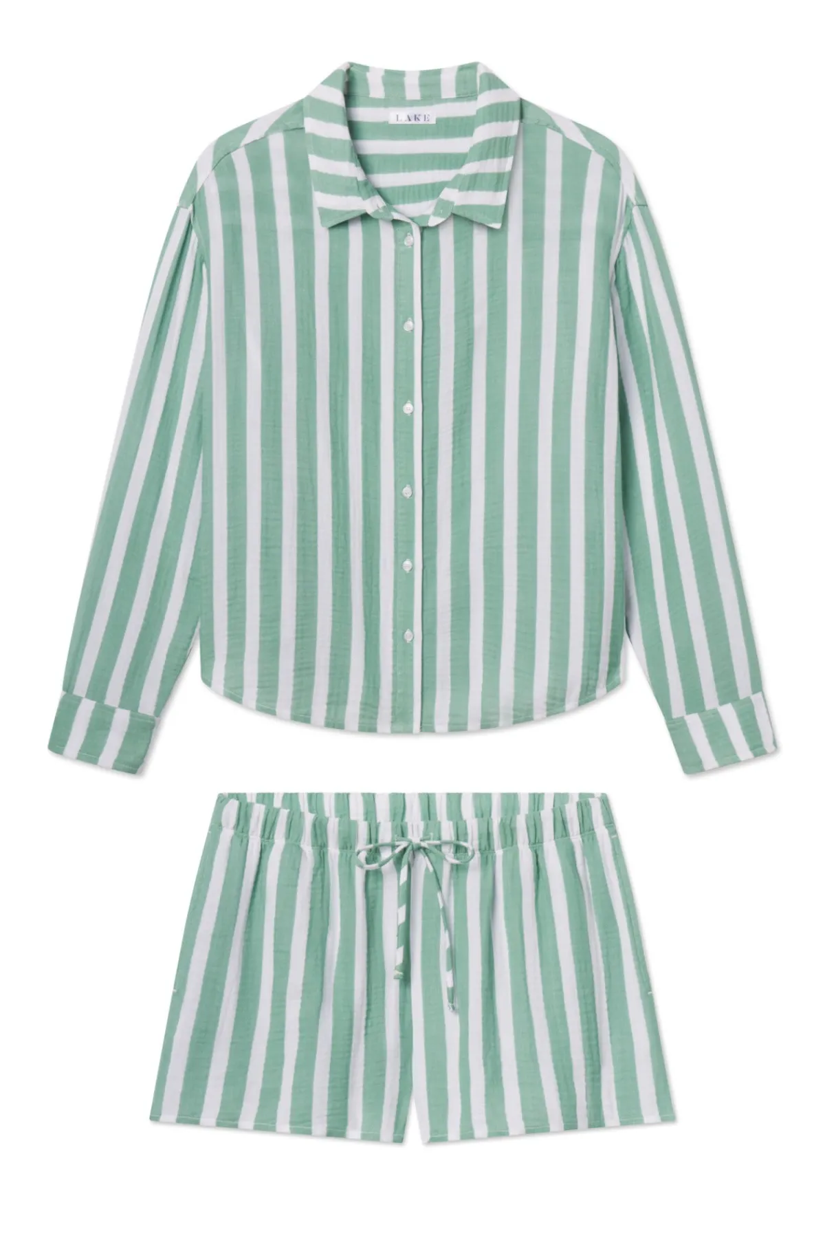 Designed in our lightweight Cotton Gauze, the Nantucket Shorts Set in Granite Green Sail Stripe, a muted green and white vertical stripe, features a collared, long-sleeve button-down top with dropped shoulders and a relaxed fit for extra comfort. The shorts have pockets, a drawstring, and an elastic waistband. Made from 59% cotton and 41% modal.