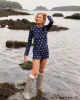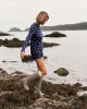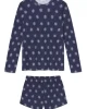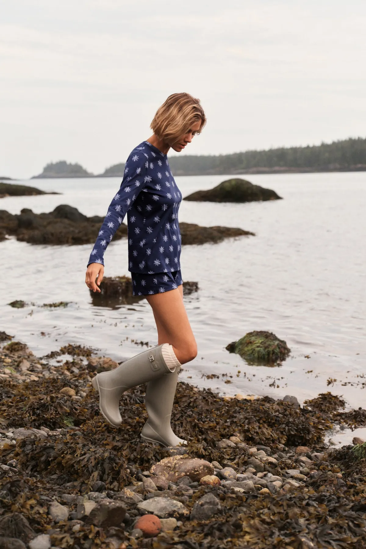 The Pima Crew Long-Short Set in English Navy Snowflakes, a festive, all-over snowflake print set on navy, features a long-sleeve crewneck top and shorts with an elastic waistband and 3″ inseam. Made from 100% Pima Cotton.