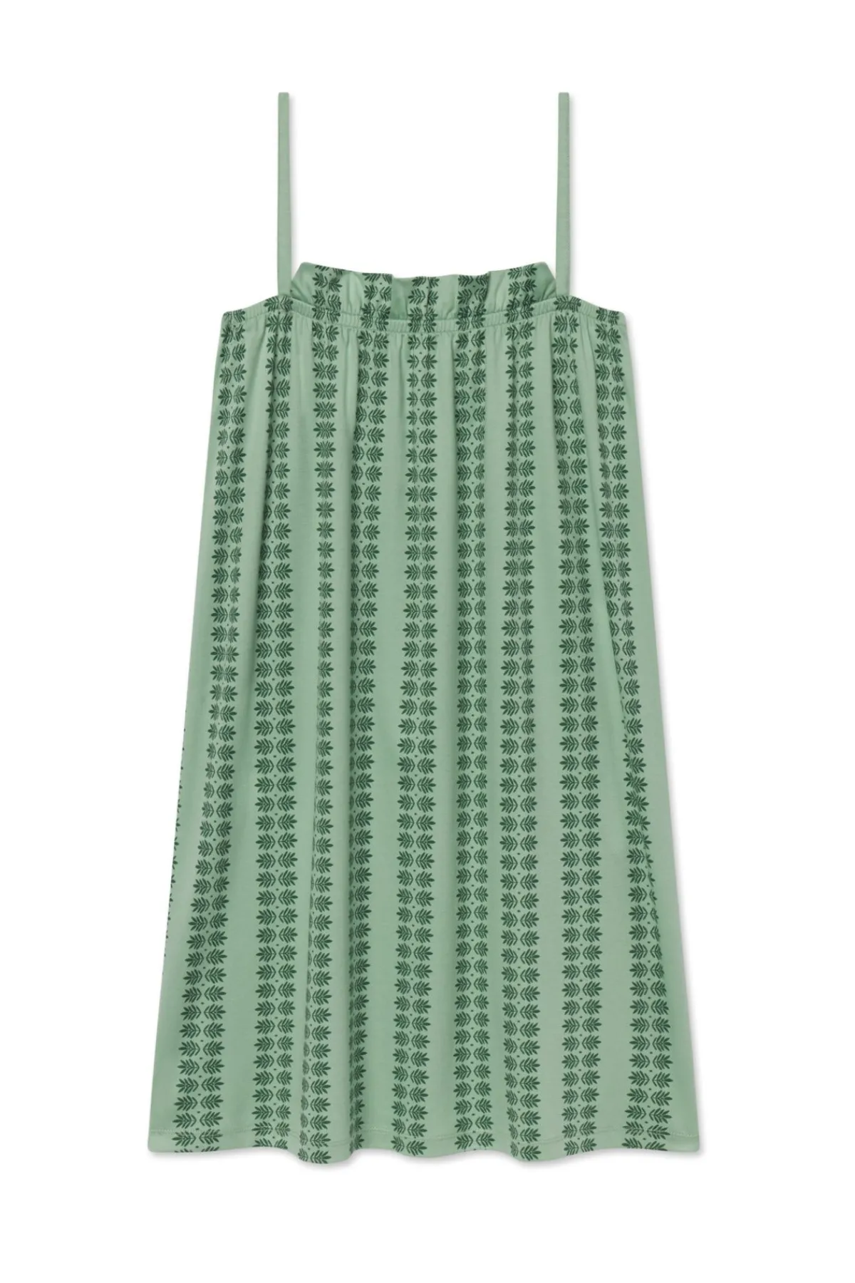 The Ruffle Nightgown in Granite Green Trellis, a tonal, muted green botanical print, was designed with simple, adjustable spaghetti straps with a fully elasticated top and is our sweetest sleepwear yet. Made from 100% Pima cotton.