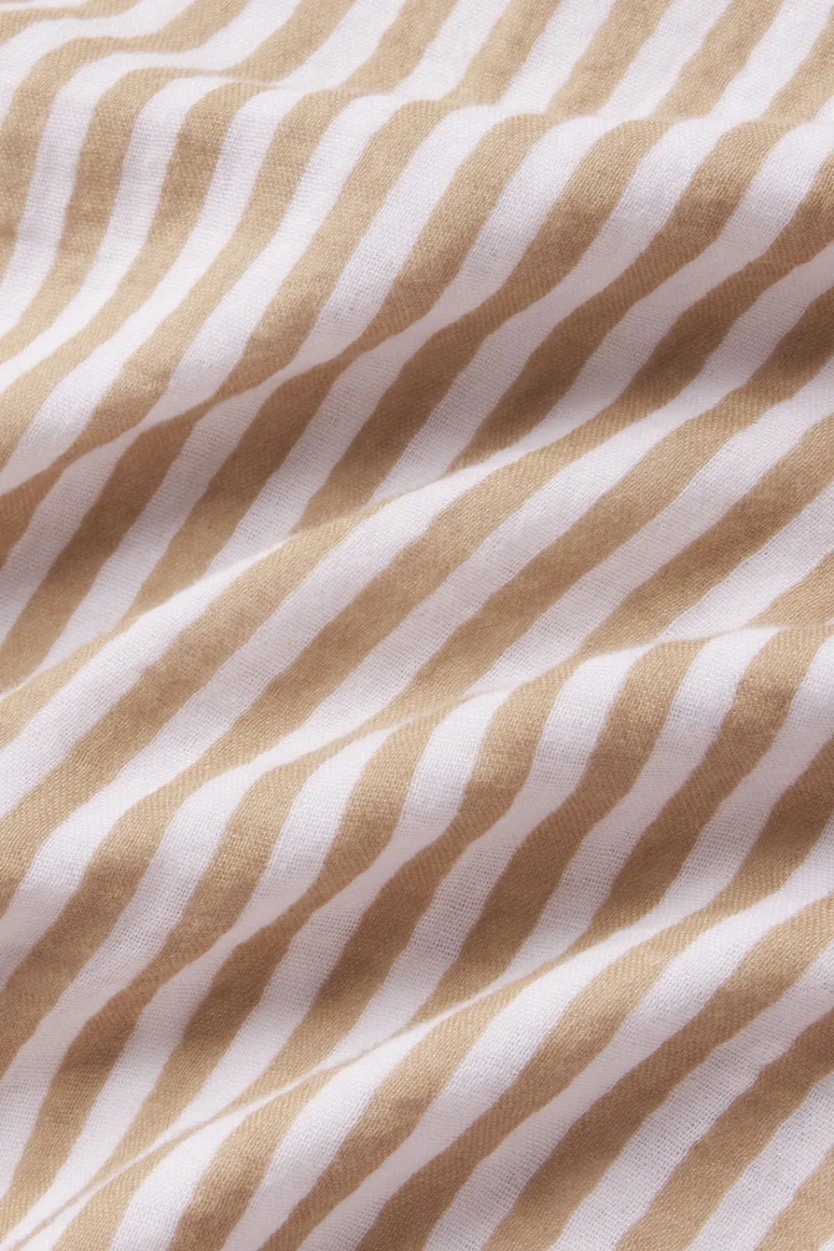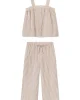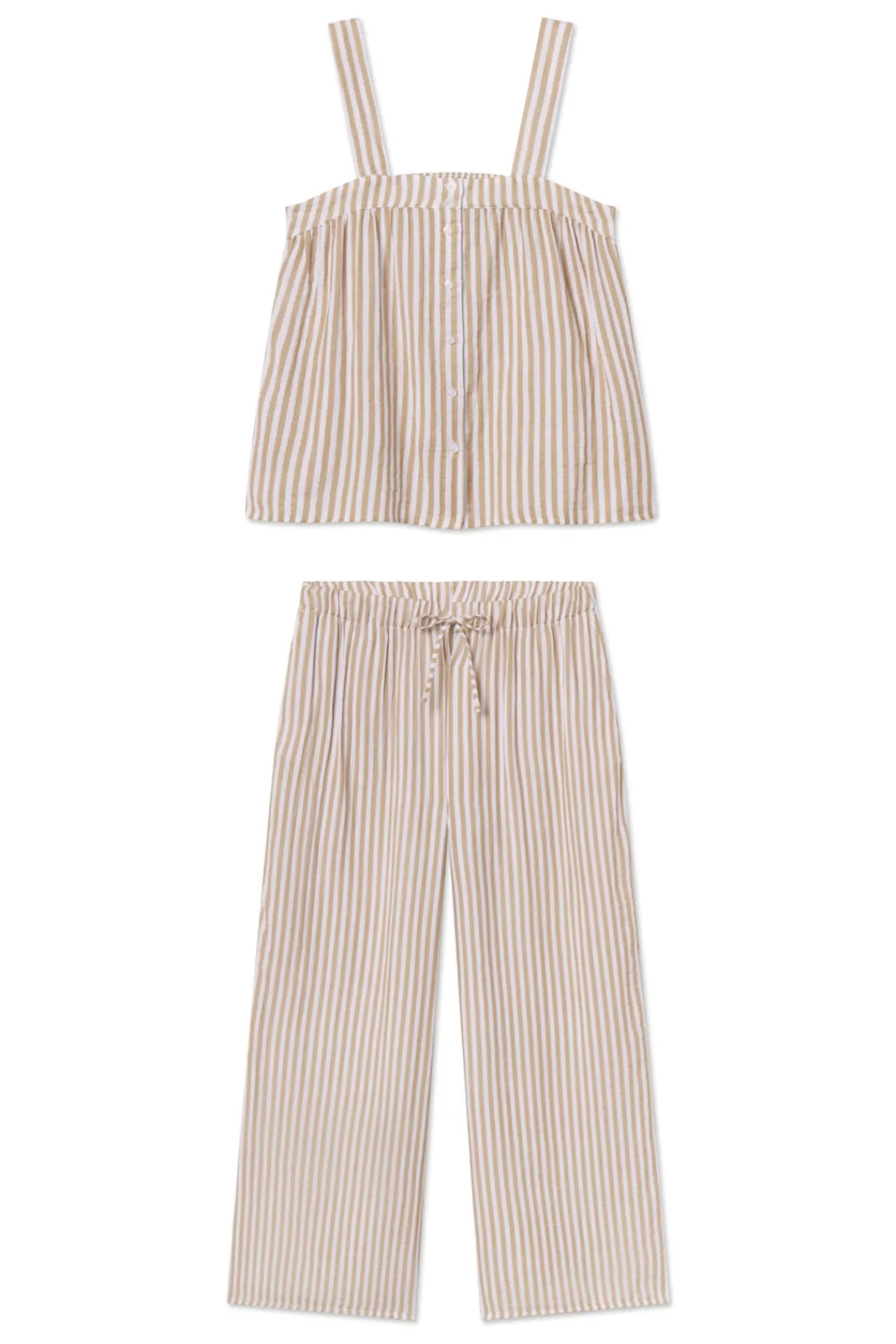 Ideal for hot sleepers in light-as-air gauze, the Hamptons Pants Set in Sandstone Awning Stripe, a warm beige and white vertical stripe, features a button-front tank top with smocking at the back for added comfort. The pants have pockets, a drawstring, and an elastic waistband. Made from 59% cotton and 41% modal.