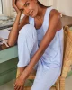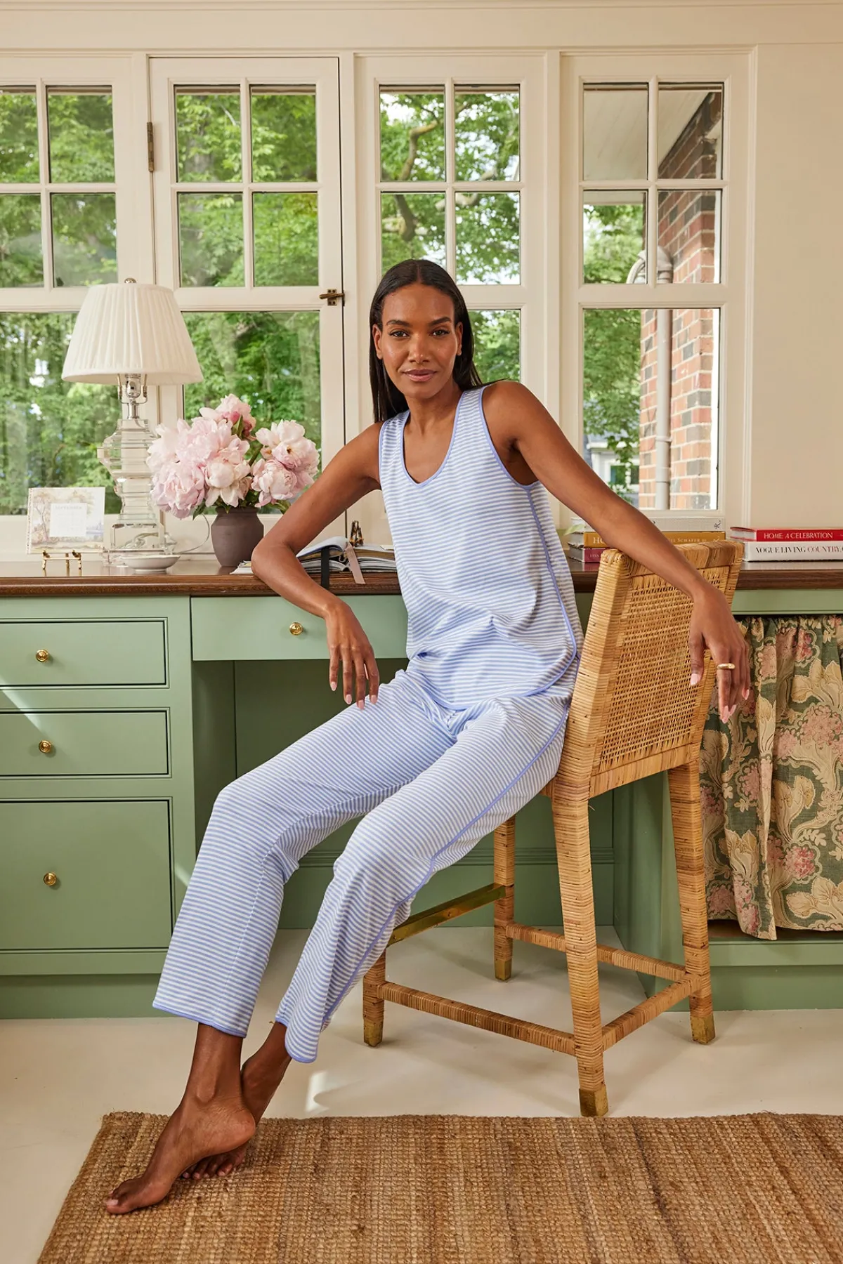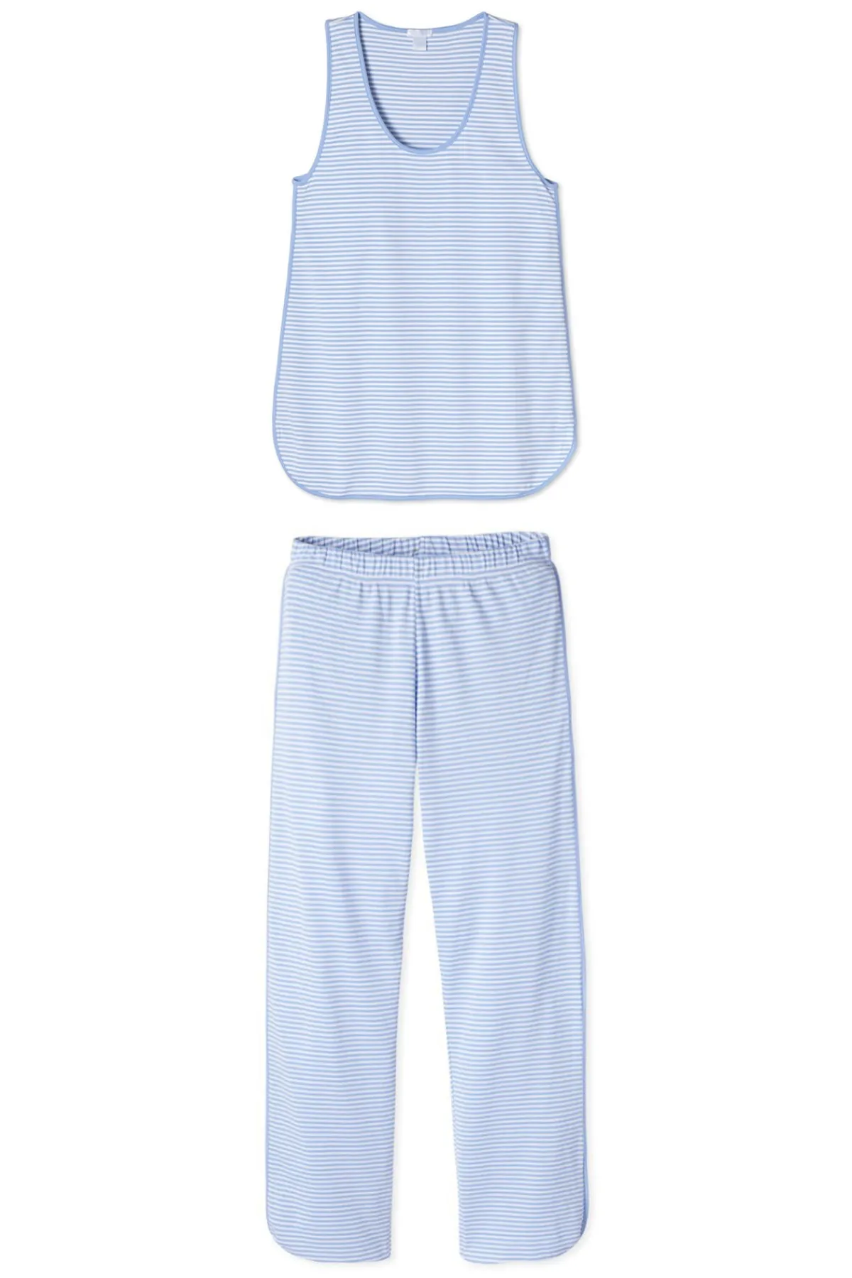The Pima Tank-Long Set in Hydrangea, our best-selling purpley-blue, features a sleeveless scoop neck top and pants with an elastic waistband. Made from 100% Pima cotton.
