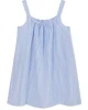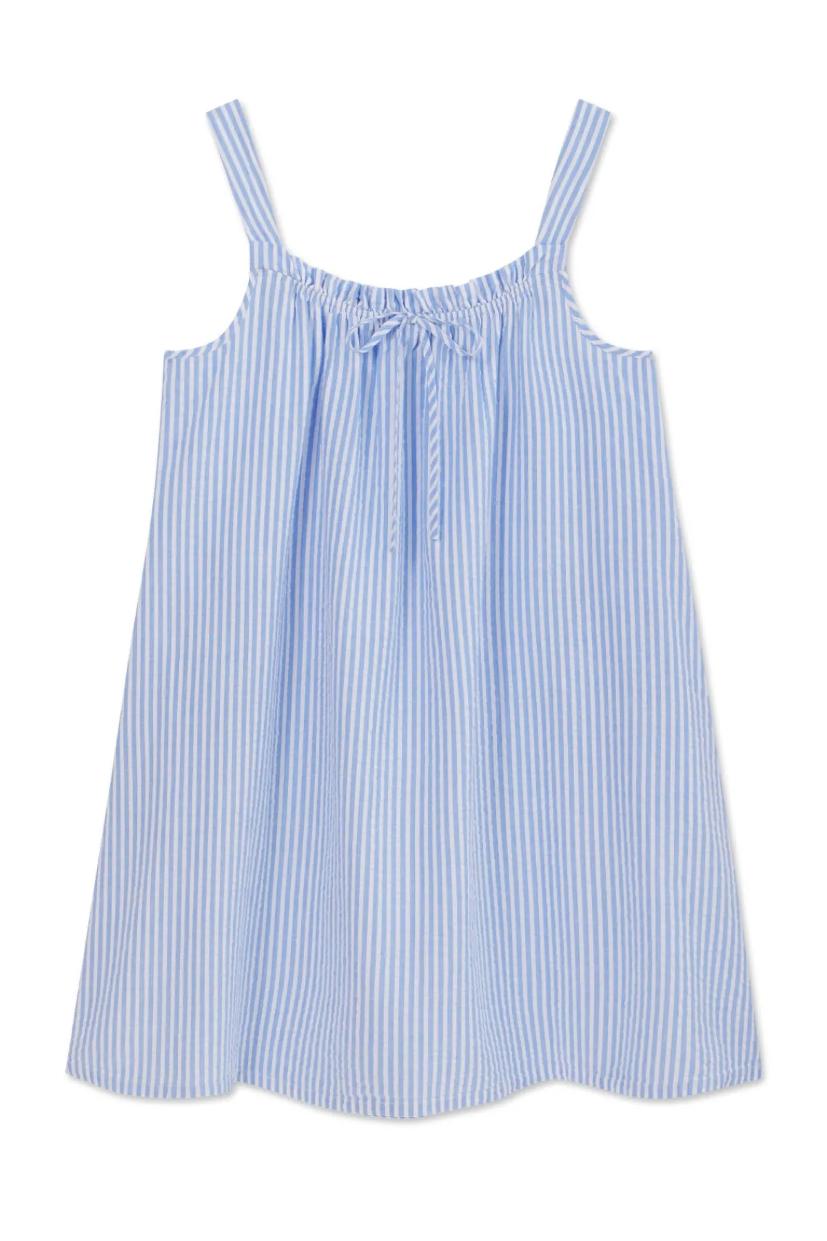 The Alice Nightgown in Blue Seersucker, a subtle, textured blue and white stripe, features a tank that’s elasticated at the front and back for comfort and fit. With a faux tie, ruffle, and pockets, this boxy silhouette is a breezy pick. Made from 100% Pima cotton.