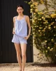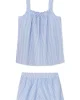 The Alice Shorts Set in Blue Seersucker, a subtle, textured blue and white stripe, features a tank that’s elasticated at the front and back for comfort and fit. A faux tie, ruffle, and boxy silhouette make this a breezy pick. The shorts have a clean silhouette with a simple side seam. Made from 100% Pima cotton.