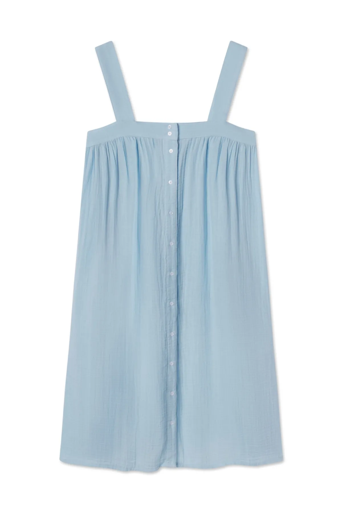Ideal for hot sleepers in light-as-air gauze, the Hamptons Nightgown in French Blue features a button-front tank top with smocking at the back for added comfort. The hemline hits above the knee. Made from 59% cotton and 41% modal.