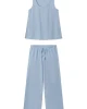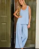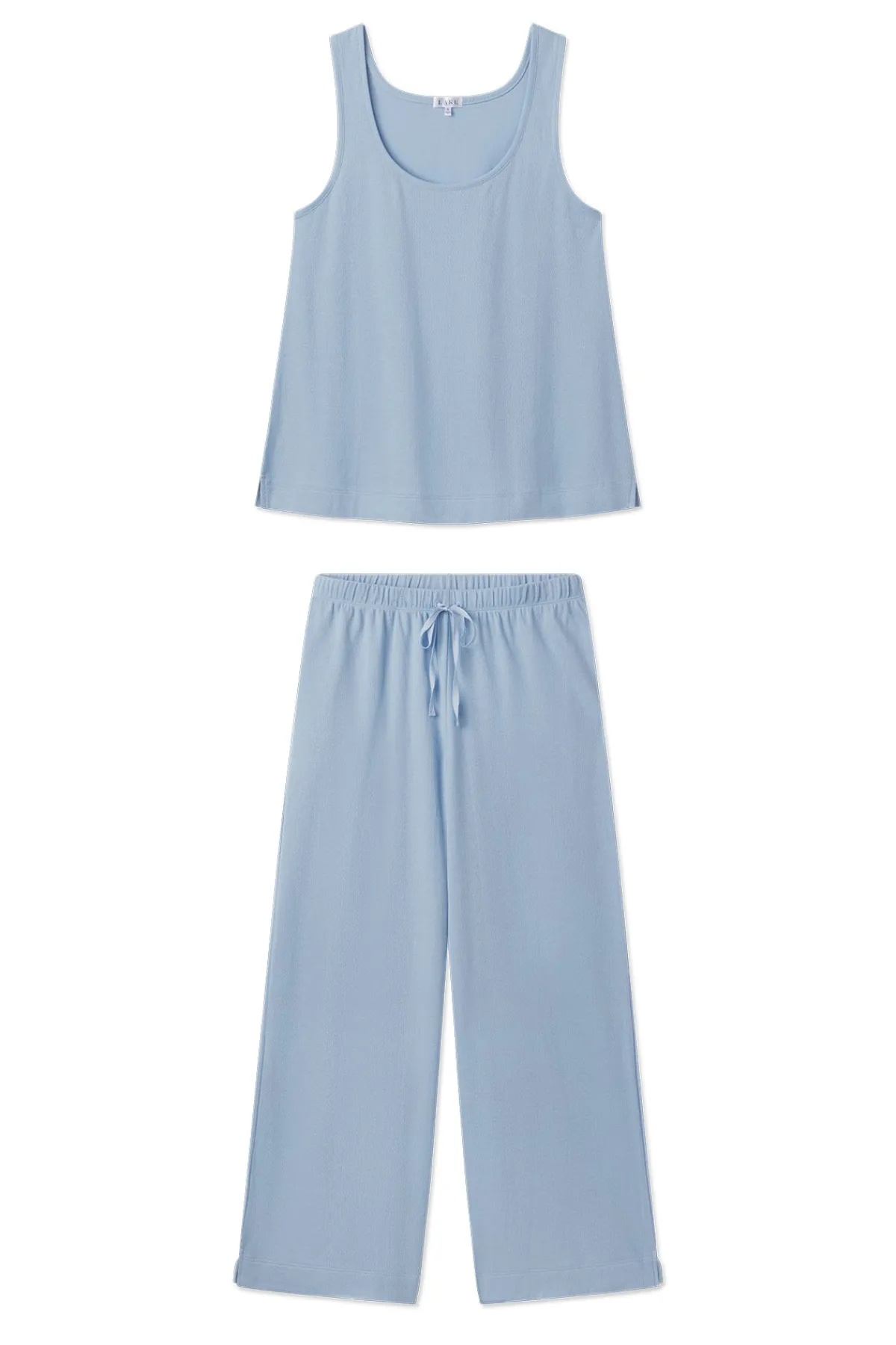 Our favorite Pima in Pointelle. Shown in French Blue Solid, our signature soft blue, this pajama set features a tonal patterned weave in a lightweight knit ideal for hot sleepers or warm climates. The scoop neck tank top has a casual swing paired with wide-leg pants with a drawstring tie. Made from 100% Pima cotton.